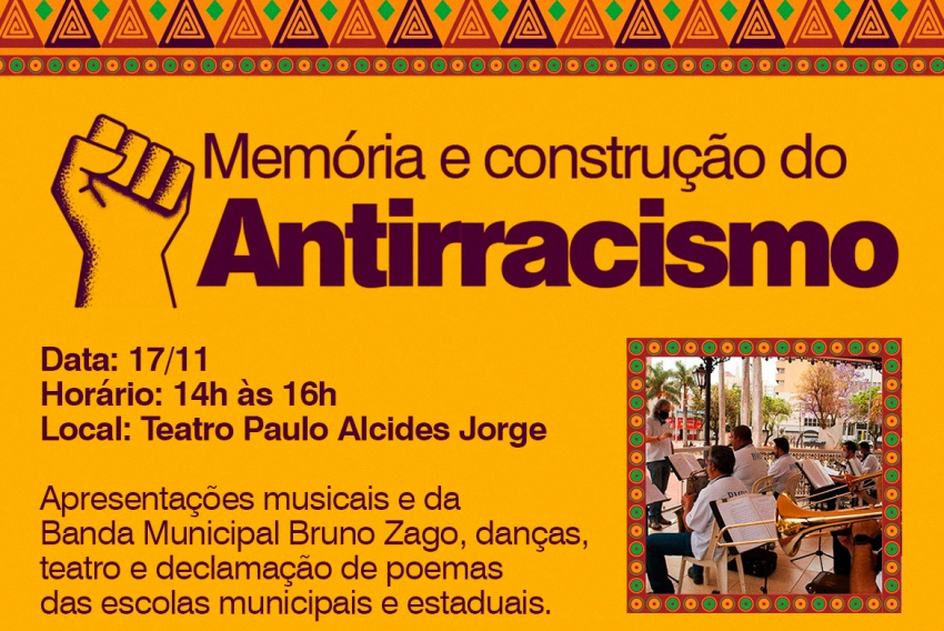 No dia 17, o evento “Memória e Construção do Antirracismo” vai unir alunos de escolas municipais e estaduais em uma série de apresentações formativas e culturais sobre o tema, visando a conscientização e reflexão para a luta contra o racismo. O encontro ocorrerá no teatro Paulo Alcides Jorge (anexo à biblioteca), das 14h às 16h.