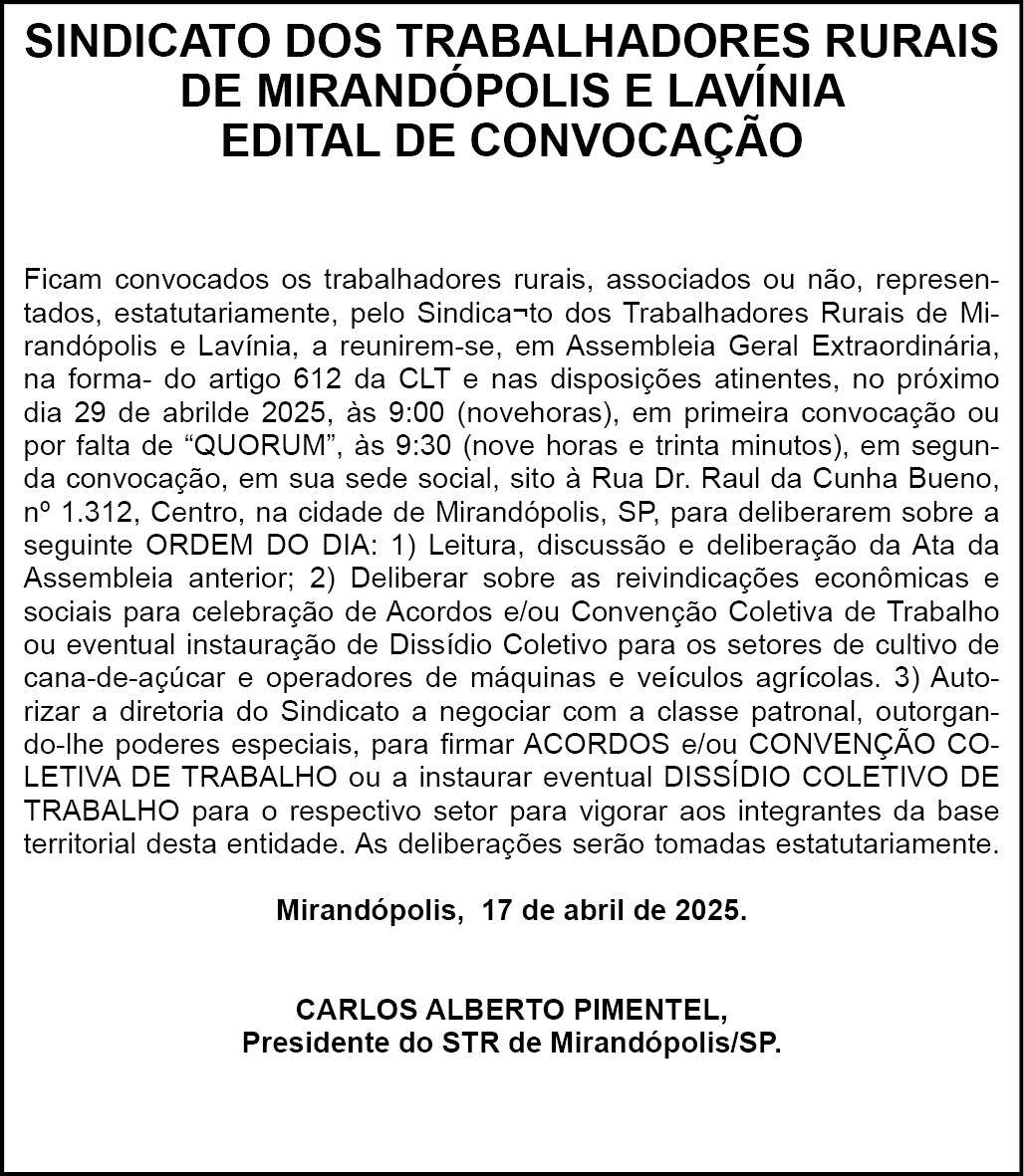 TRAB. RURAIS. MIRAND EDITAL DE CONVOCAÇÃO 18.04.2025 07h00 | Tempo de leitura: < 1 min Certificado: Google Cloud Facebook Whatsapp Twitter Comentários Comentários Enviar