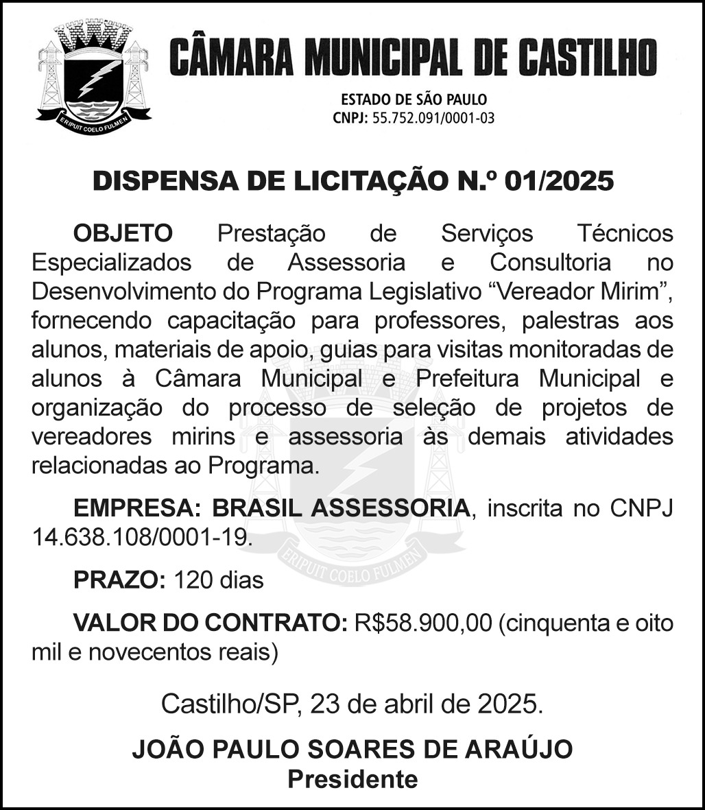 CÂMARA MUN. CASTILHO DISPENSA DE LICITAÇÃO 25.04.2025 07h00 | Tempo de leitura: < 1 min Certificado: Google Cloud Facebook Whatsapp Twitter Comentários Comentários Enviar