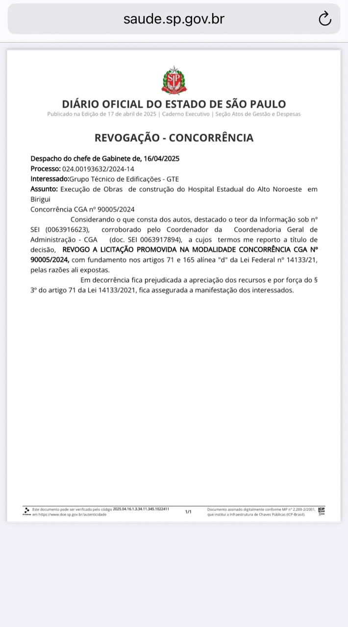 O governo do Estado de São Paulo revogou a licitação pública que previa a contratação da empresa responsável pela construção do Hospital Estadual Alto Noroeste, em Birigui. A decisão consta em despacho publicado no Diário Oficial, ao qual a Folha da Região/Sampi teve acesso.