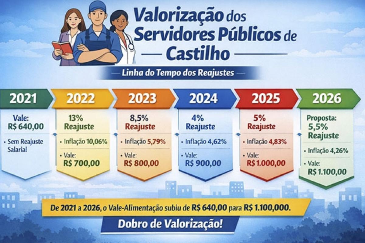 A Prefeitura de Castilho encaminhou à Câmara de Vereadores um projeto de lei que estabelece reajuste de 5,5% nos salários dos servidores públicos municipais a partir de 2026. A proposta também contempla a ampliação do vale-alimentação, que passará dos atuais R$ 1.000,00 para R$ 1.100,00.