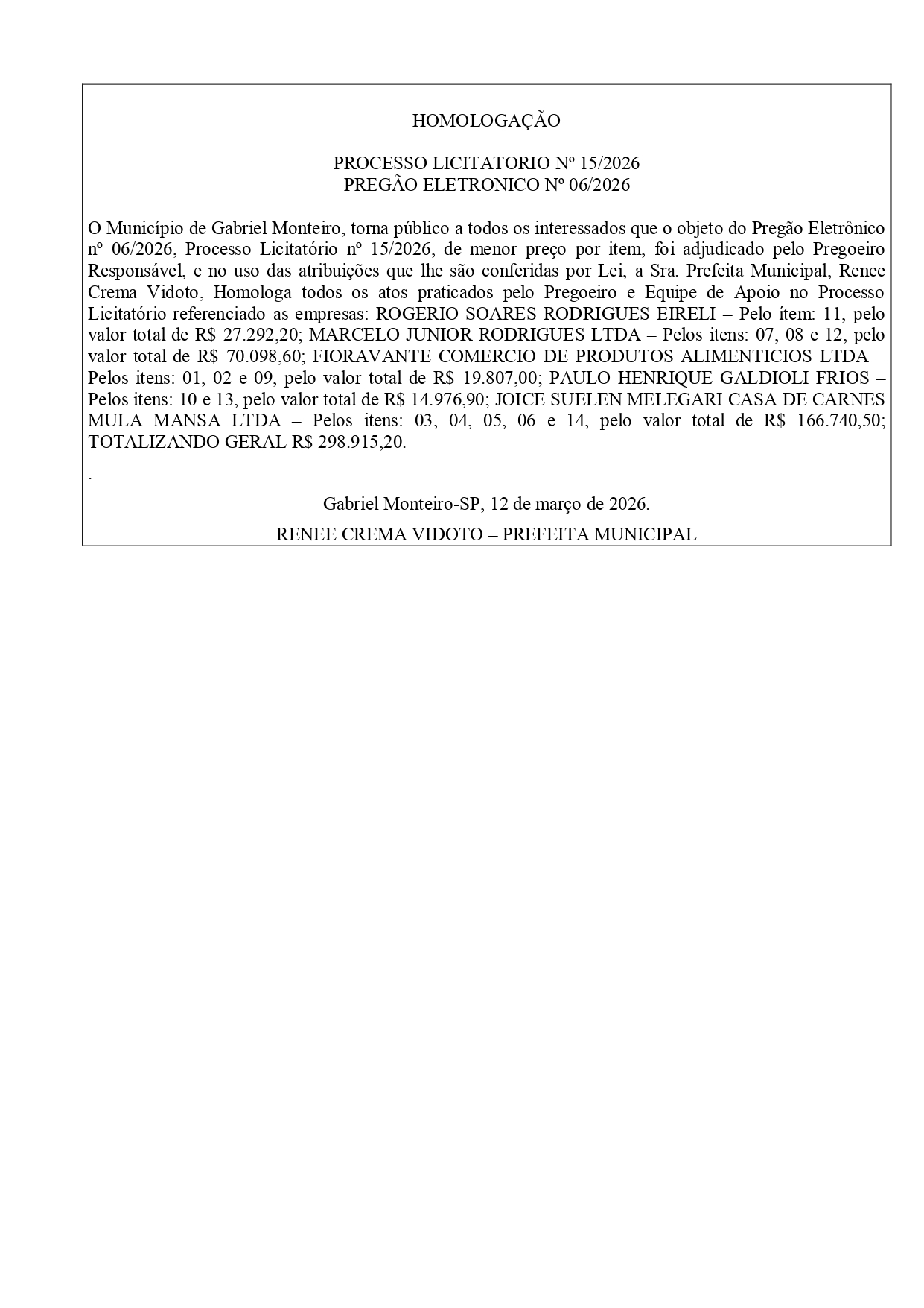 PREF. GABRIEL MONTEI HOMOLOGAÇÃO 13.03.2026 08h55 | Tempo de leitura: < 1 min Certificado: Google Cloud Facebook Whatsapp Twitter Comentários Comentários Enviar