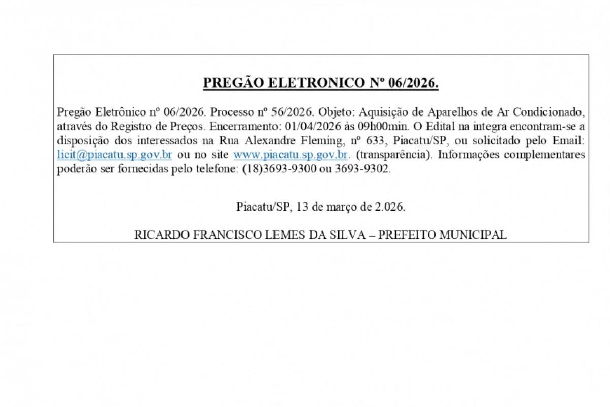 PREF. GABRIEL MONTEI PREGÃO ELETRONICO Nº 06/2026. 14.03.2026 08h00 | Tempo de leitura: < 1 min Certificado: Google Cloud Facebook Whatsapp Twitter Comentários Comentários Enviar