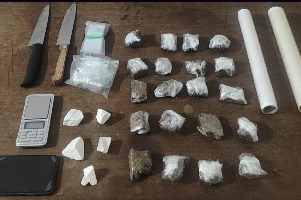 No local, foram apreendidos aproximadamente 400 gramas de maconha, cerca de 78 gramas de pasta base de cocaína, além de uma balança de precisão, plásticos utilizados para embalo, facas com vestígios de entorpecentes, um celular e dezenas de embalagens do tipo ziplock.