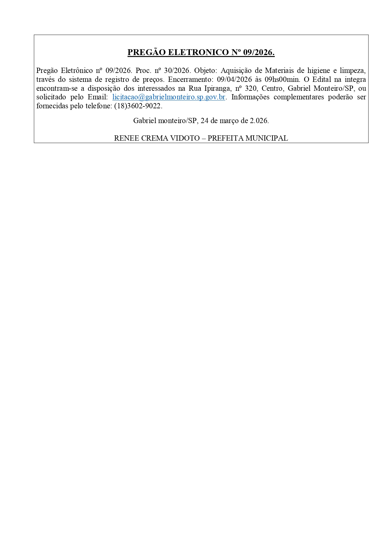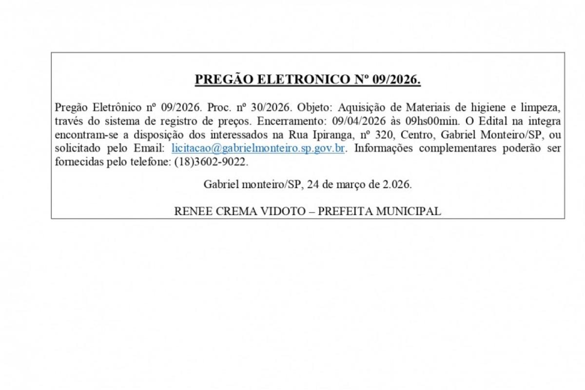 PREF. GABRIEL MONTEI PREGÃO ELETRÔNICO N°09/2026 25.03.2026 08h00 | Tempo de leitura: < 1 min Certificado: Google Cloud Facebook Whatsapp Twitter Comentários Comentários Enviar