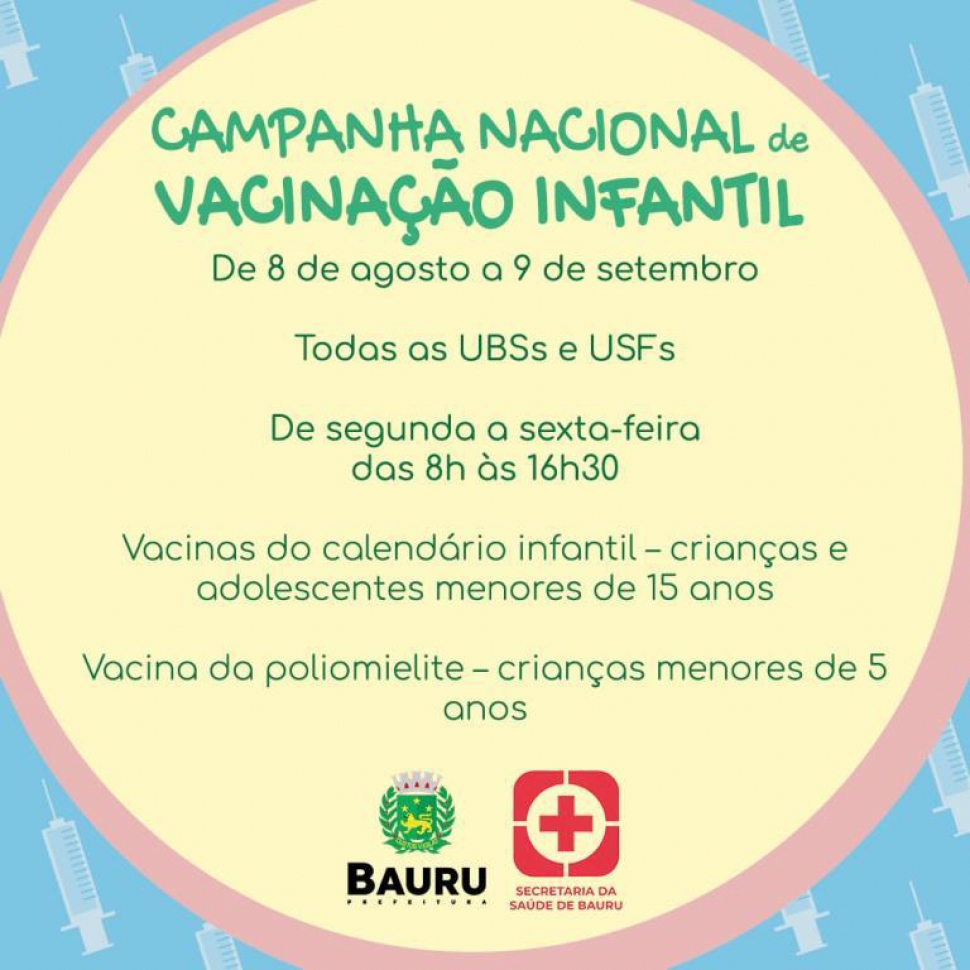 Campanha de vacinação infantil segue até a semana que vem nas unidades de saúde em Bauru