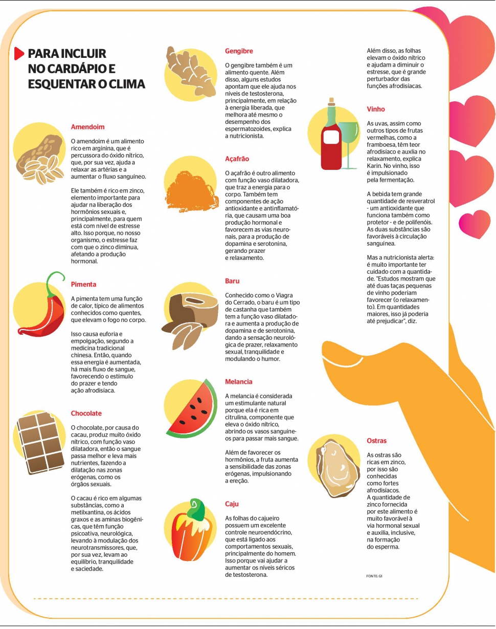 Mas a nutricionista alerta: não adianta consumir o alimento apenas na "hora H", é preciso incluí-los na rotina, somente assim terão efeitos reais no organismo. Veja abaixo dez alimentos naturais e afrodisíacos - e seus benefícios - que podem dar um "up" na vida sexual.