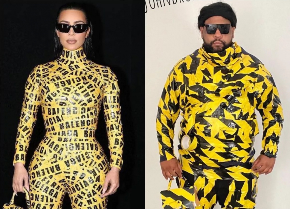 A empresária e socialite Kim Kardashian, 41, assistiu ao desfile da Balenciaga, na Semana de Moda de Paris, com o corpo totalmente coberto com uma fita adesiva amarela estampada com o nome da grife espanhola. O macacão feito com fitas virou piada, memes nas redes sociais e foi reproduzido pelo influenciador brasileiro John Drops.