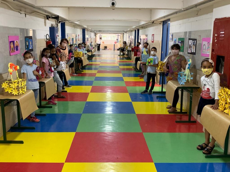 O resultado da ação artística foi apresentado em uma mostra expositiva, que coloriu os corredores da escola estadual com as mais variadas texturas e formas escolhidas pelas crianças.