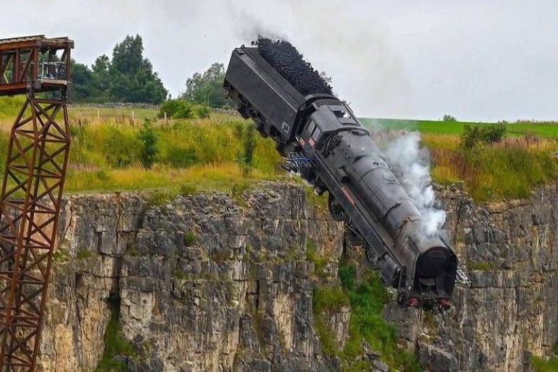 A cena foi filmada em Derbyshire, um condado na região de Midlands Oriental, na Inglaterra. A estrela maior do filme, o ator, Tom Cruise, 59, estava no local para testemunhar a queda da locomotiva.