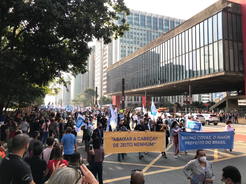 Entre os apoiadores, um grupo trouxe uma faixa com uma das últimas manifestações de Covas, no hospital, que dizia: "Abaixar a cabeça? De jeito nenhum".