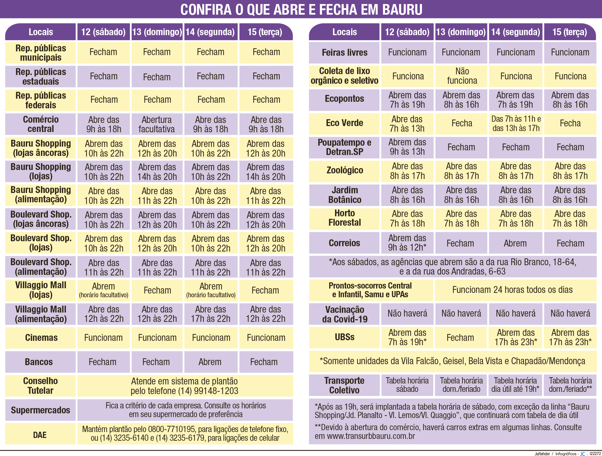 Ao final do expediente desta sexta-feira (11), terá início o último "feriadão" de 2022. Serão quatro dias de descanso para muitos trabalhadores, por conta da Proclamação da República, celebrada na próxima terça-feira (15), e do ponto facultativo na segunda (14). Dessa forma, o expediente de vários serviços de Bauru sofrerão alterações (confira os principais no quadro abaixo). Mas, para contemplar aquelas pessoas que desejam ir às compras durante o tempo de folga, as lojas do Calçadão da Batista de Carvalho, no Centro, abrirão normalmente na terça, das 9h às 18h.
