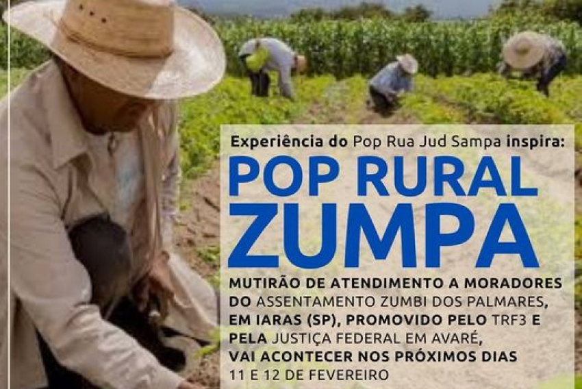 Iaras - Tribunal Regional Federal da 3ª Região (TRF3) e Justiça Federal em Avaré promovem, neste sábado (11) e domingo (12), das 10h às 16h, mutirão de atendimento aos moradores do Zumbi dos Palmares, na escola do assentamento, em Iaras (90 quilômetros de Bauru). O projeto, batizado de Pop Rural ZumPa, tem inspiração no Pop Rua Jud, realizado em 2022, na Capital paulista, e levará serviços das áreas de saúde, assistência social, cidadania e orientações profissionais às 450 famílias do assentamento.