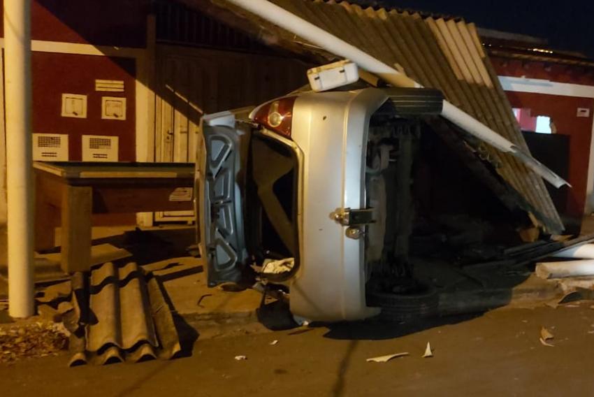 Um carro ficou completamente destruído ao colidir em uma residência e capotar, no Jardim São Domingos, em Campinas, na madrugada desta sexta-feira, 23.