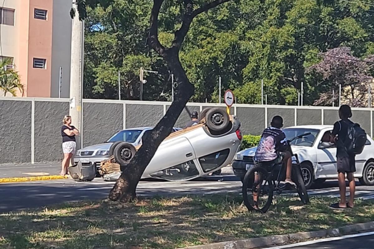 Carro capota após acidente em avenida de Bauru