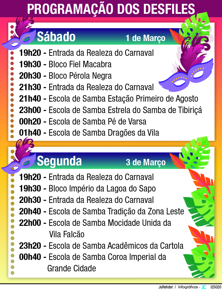 Neste sábado, quatro escolas de samba e dois blocos tomarão a avenida, enquanto na segunda-feira outras quatro escolas e um bloco se apresentam. A ordem dos desfiles foi definida na semana anterior pelas escolas e blocos, com prioridade para as vencedoras do ano passado, conforme previsto em edital.