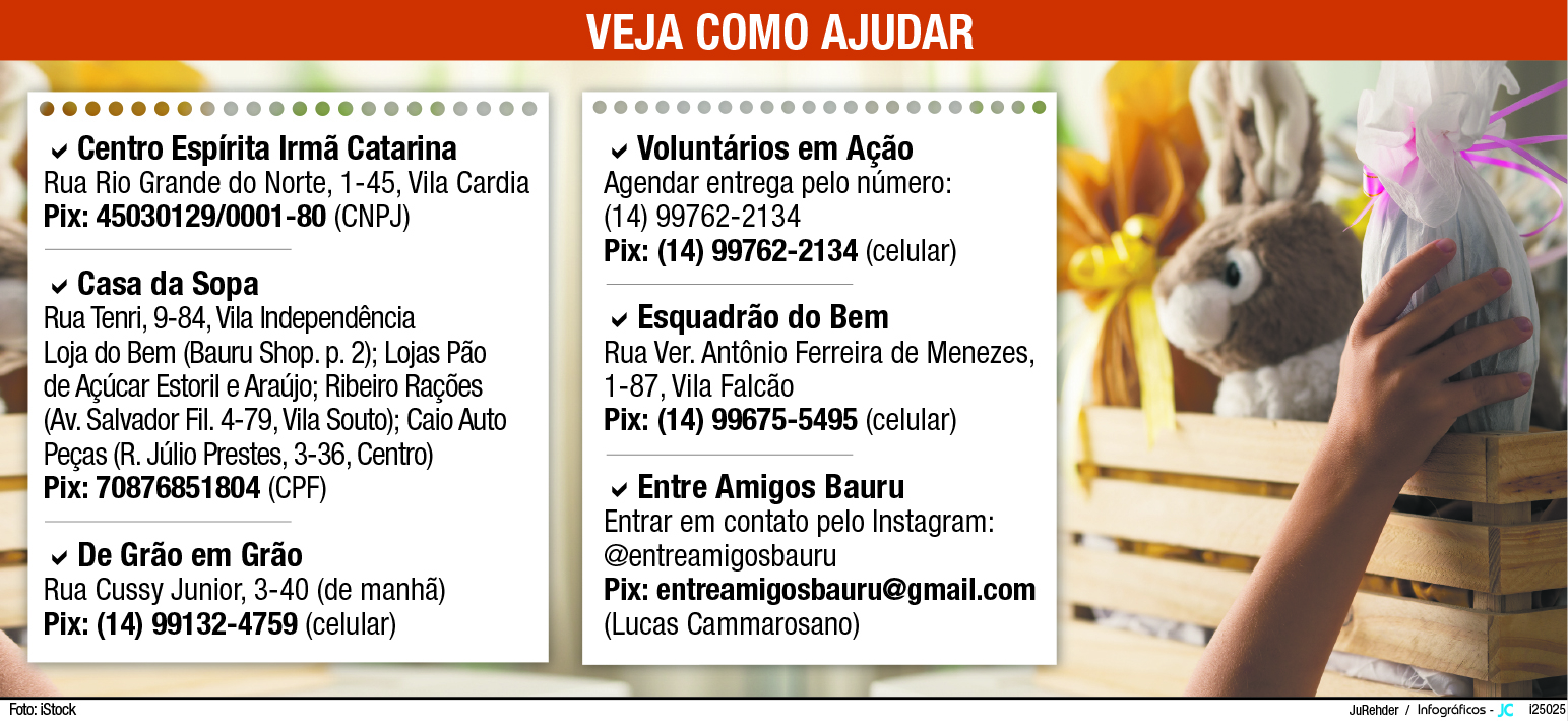 A Casa da Sopa, Centro Espírita Irmã Catarina, Entre Amigos Bauru, Esquadrão do Bem e Voluntários em Ação também estão empenhados em adoçar o prato das comunidades que assistem, nesta Páscoa. Para isso, solicitam a quem puder contribuições via PIX ou doações (veja quadro).