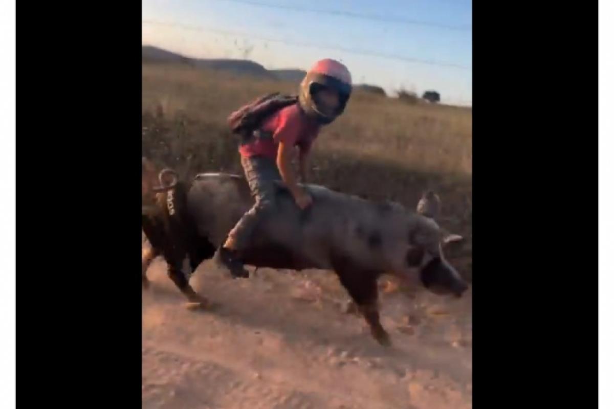 Um jovem ainda não identificado, apelidado nas redes como “o querido”, foi flagrado voltando da escola montado em uma porca, usando capacete e a porca usando um short da Adidas.