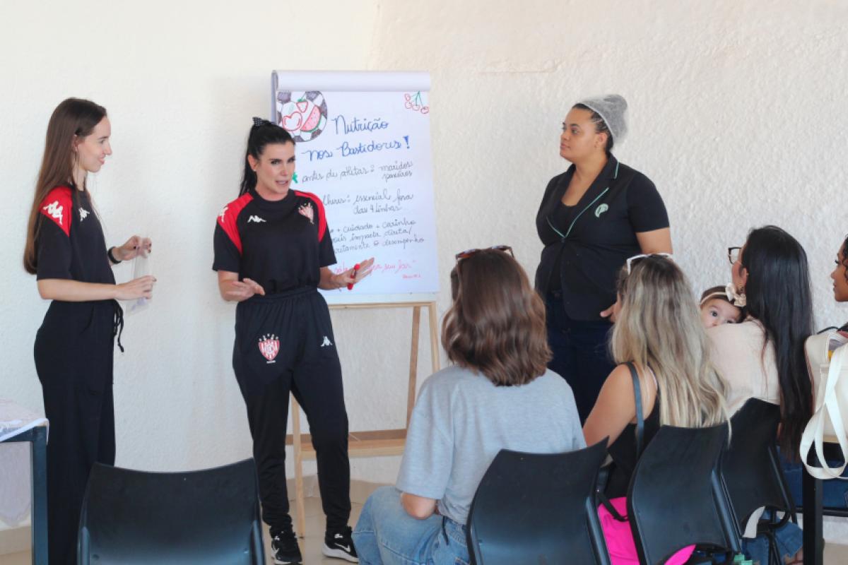 "Buscamos juntos o melhor rendimento e a prevenção de lesões. Pensando nisso, promovemos aqui no Noroeste, em parceria com a Nutrisaúde, um café com a participação das esposas dos jogadores, no qual explicamos conceitos básicos de nutrição, orientações para o pré-treino e a importância da hidratação. Assim, elas podem nos ajudar de forma mais carinhosa e afetiva na busca pela melhor performance dos atletas, porque uma partida vitoriosa começa dentro de casa", destacou Carol Bernardino, que atua no Noroeste há sete anos, desde quando o clube ainda disputava a Série A3 do Campeonato Paulista.
