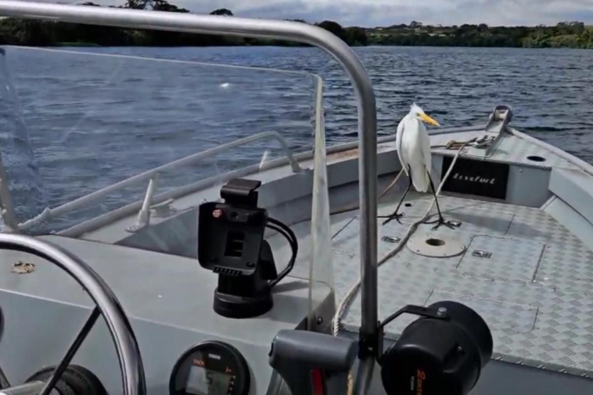 Garça pega carona em barco da Polícia Ambiental na região; VÍDEO