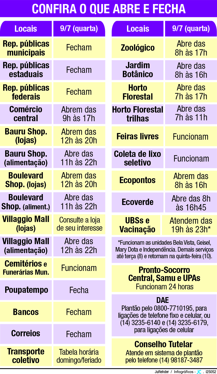 Nos shoppings, a programação será mantida com variações entre setores. As lojas do Bauru Shopping e do Boulevard estarão abertas das 12h às 20h. Já as praças de alimentação funcionam das 11h às 22h. O Villaggio Mall terá atendimento na área de alimentação das 12h às 22h. Em relação a outros serviços, a recomendação é consultar diretamente cada estabelecimento.