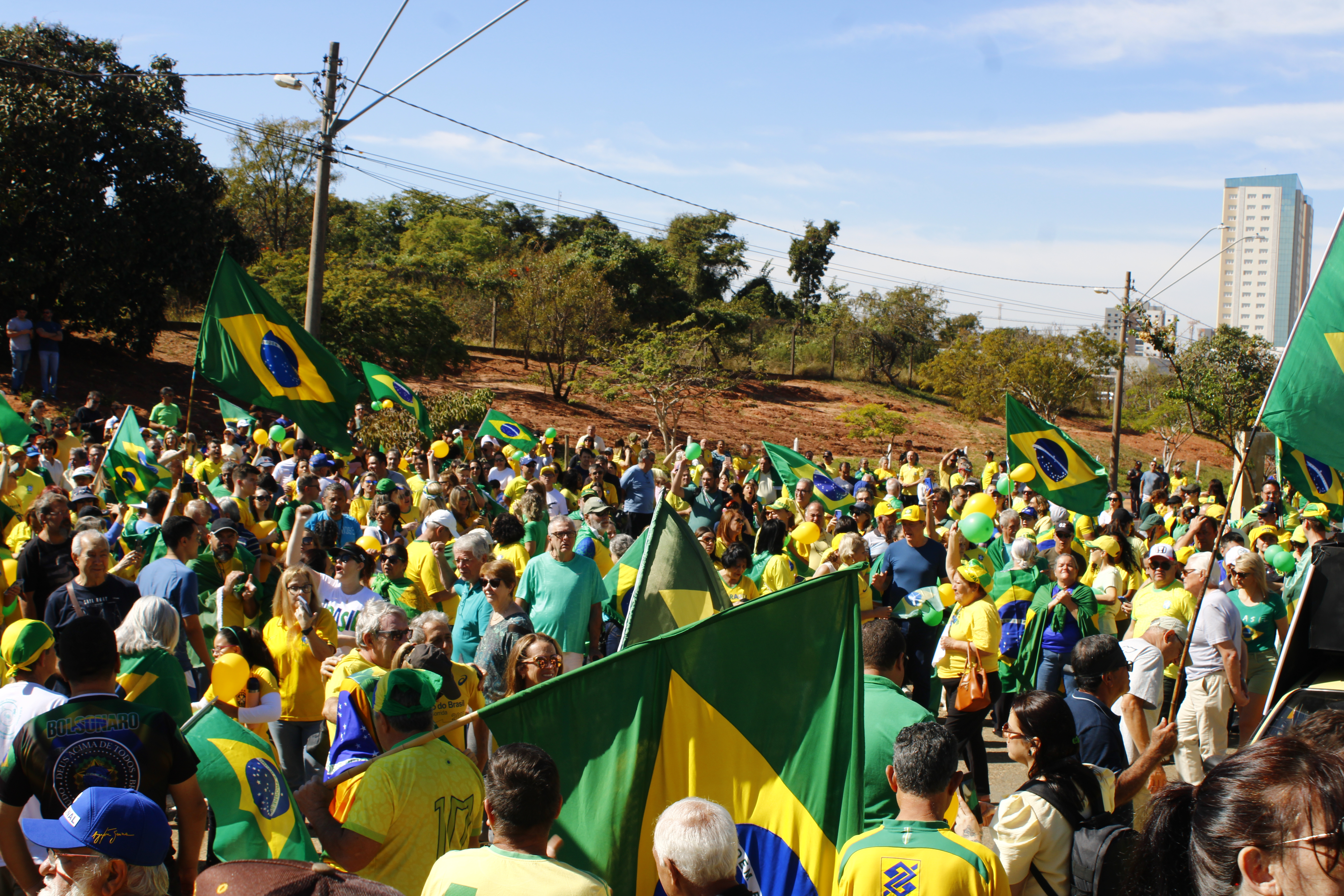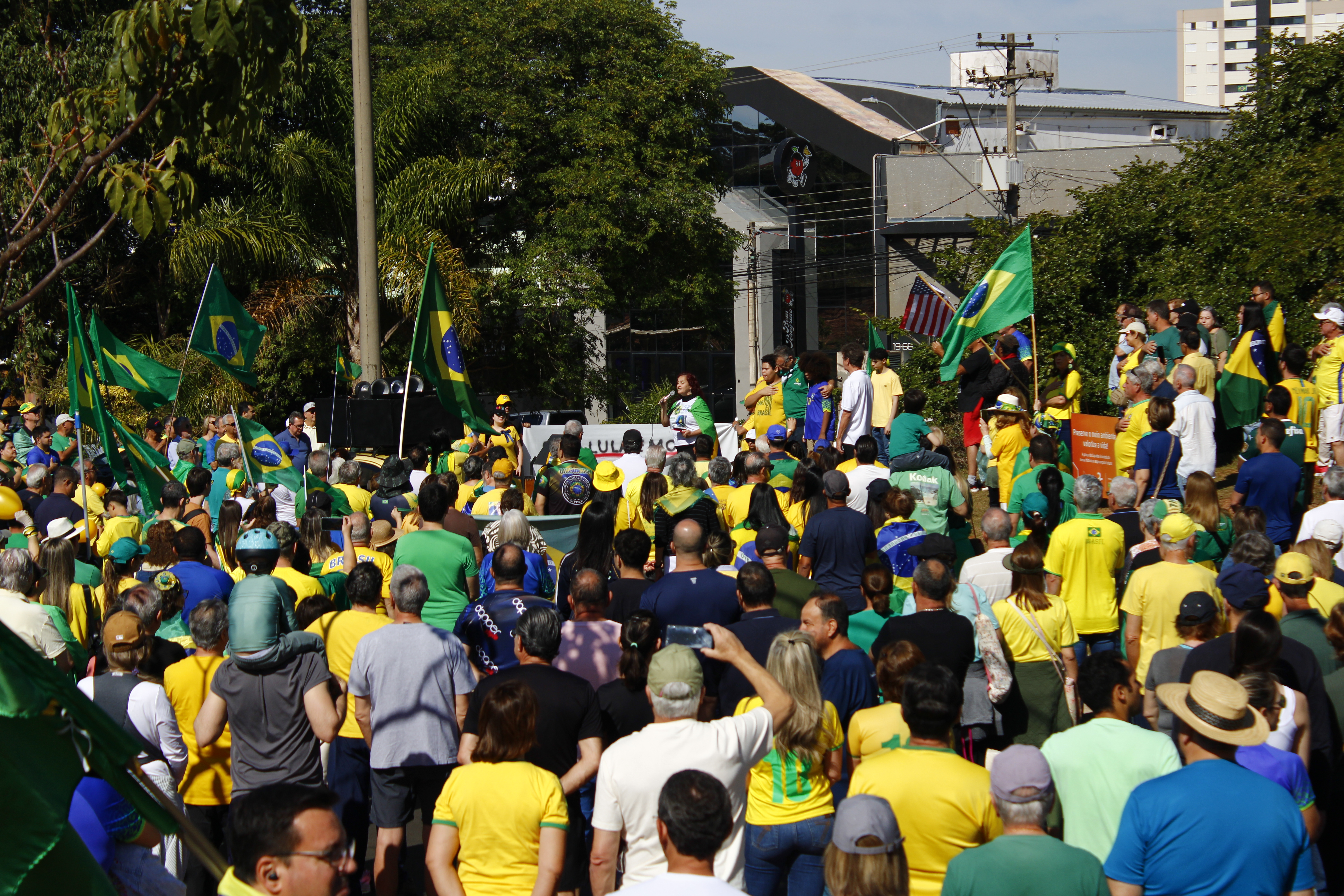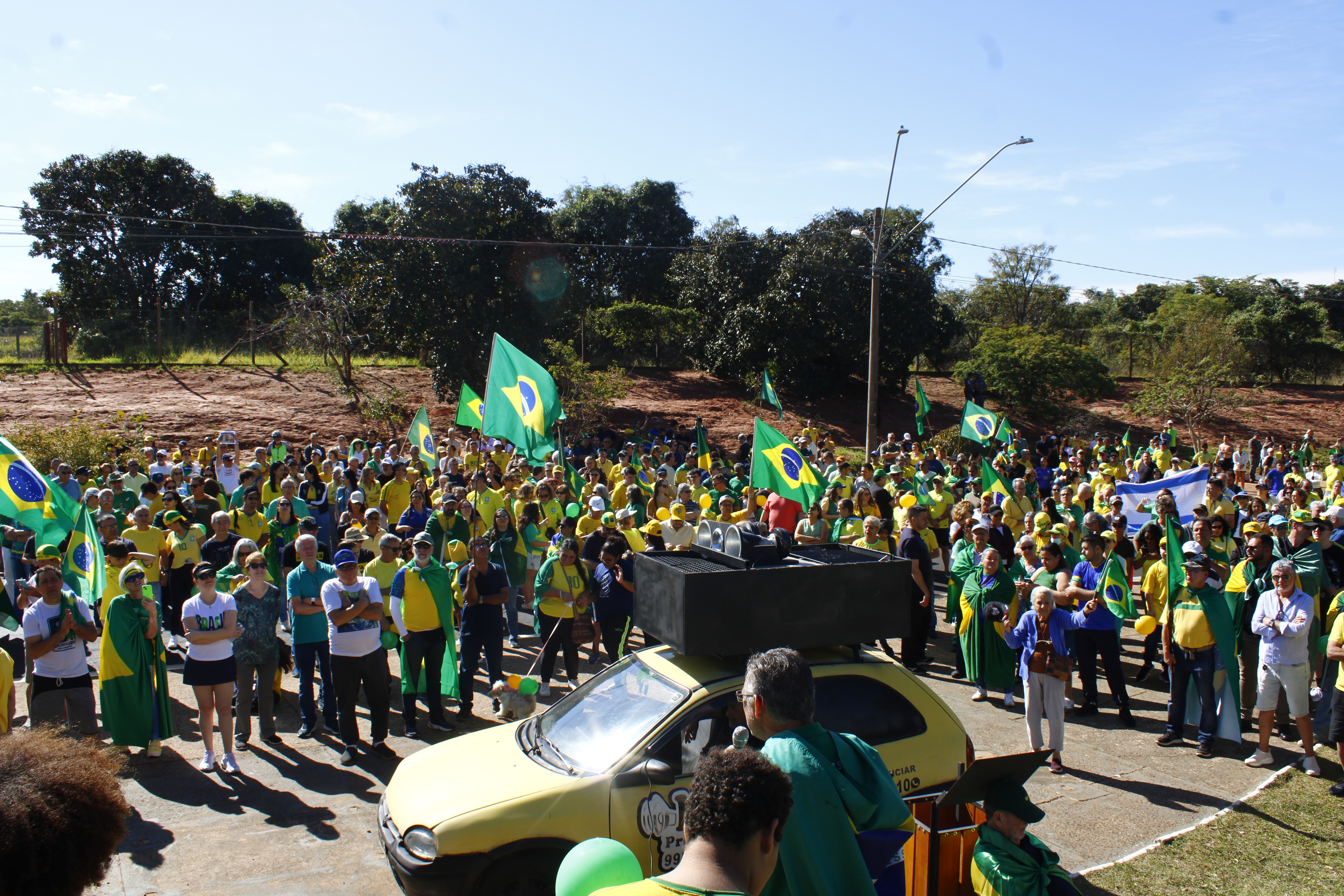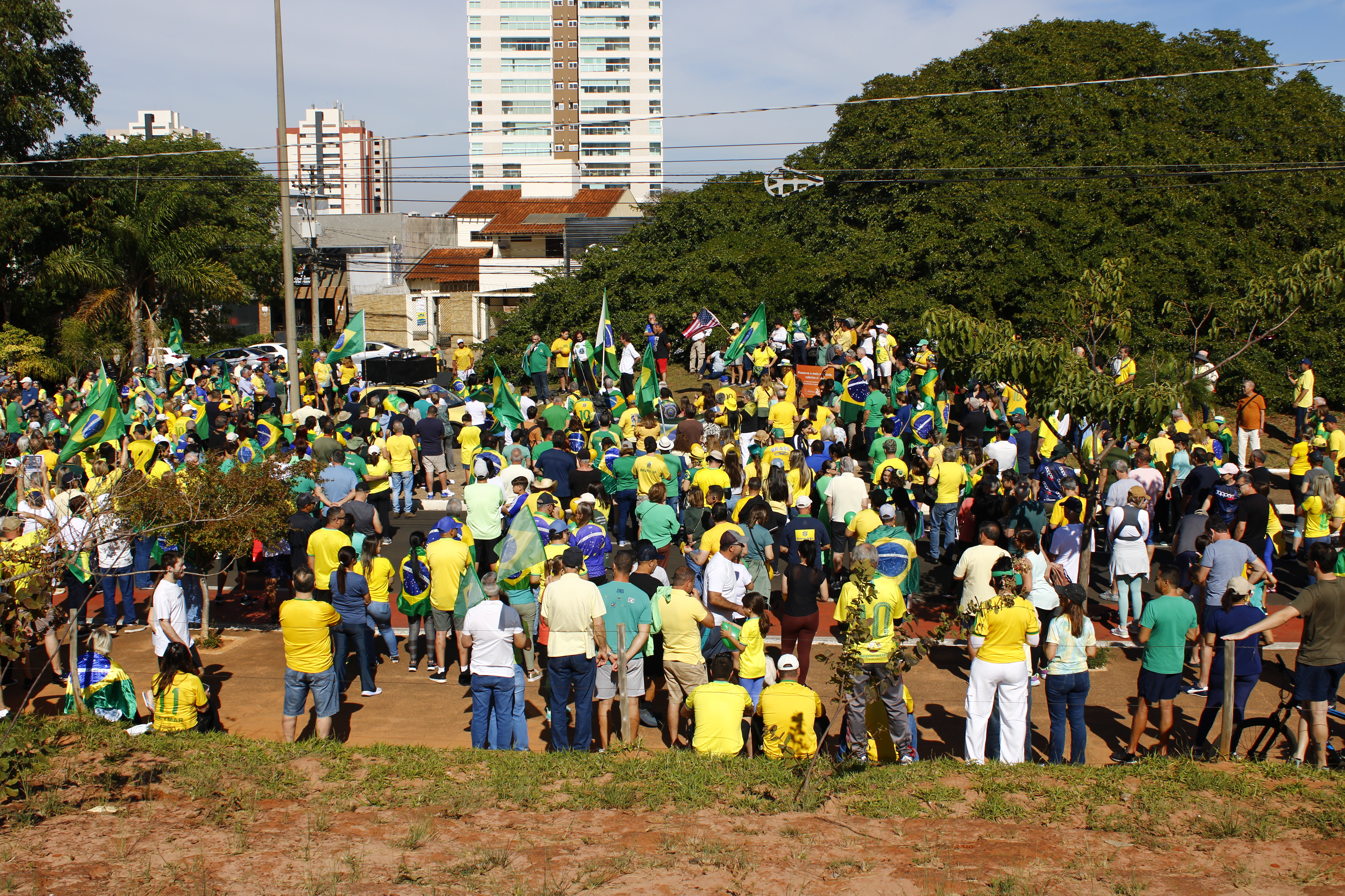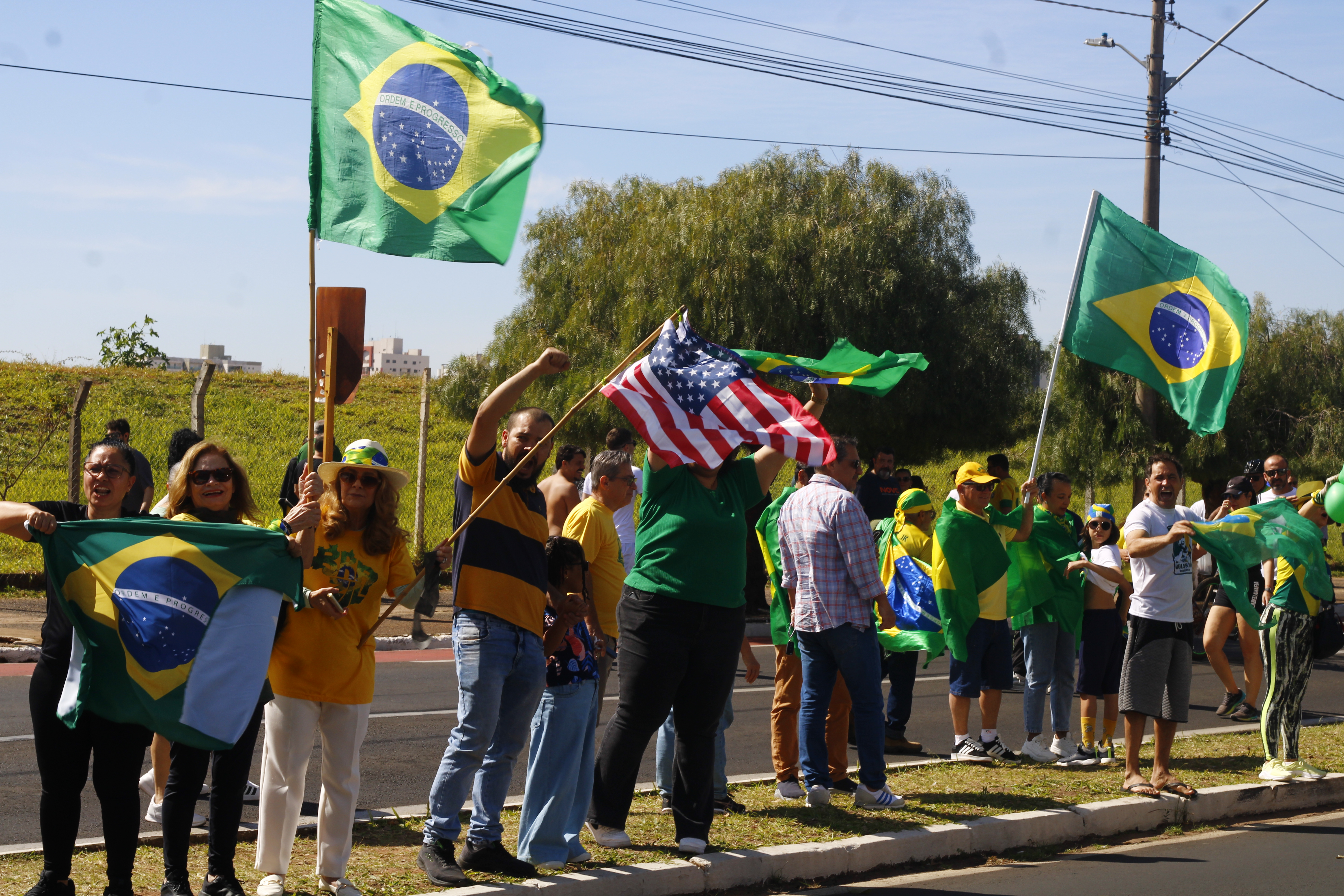 Após os discursos, os manifestantes caminharam até a quadra 5 da rua Ignacio Alexandre Nasralla, onde empunharam bandeiras do Brasil e aplaudiram motoristas que buzinavam em apoio. Um dos gritos mais ouvidos era: “A nossa bandeira jamais será vermelha”.