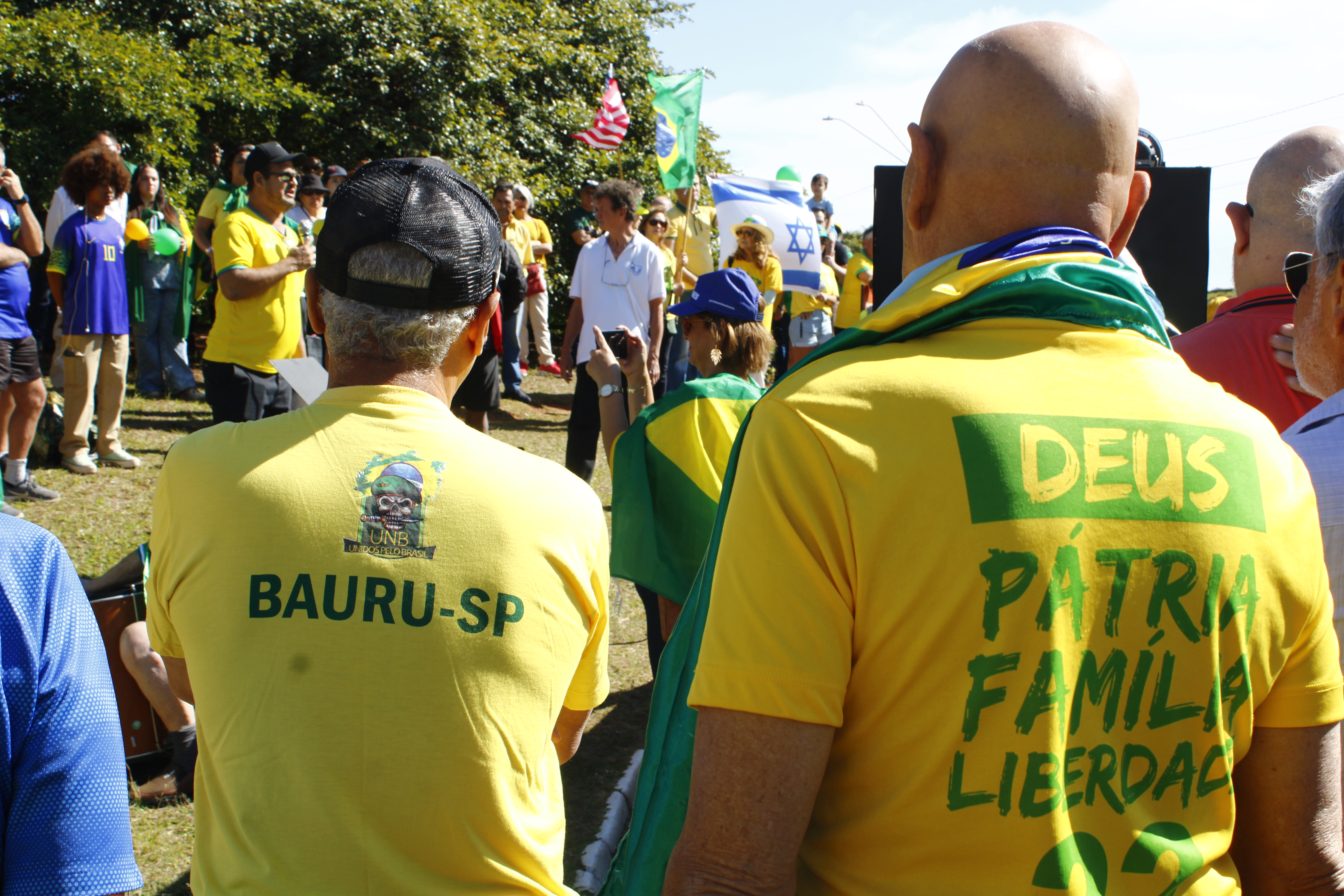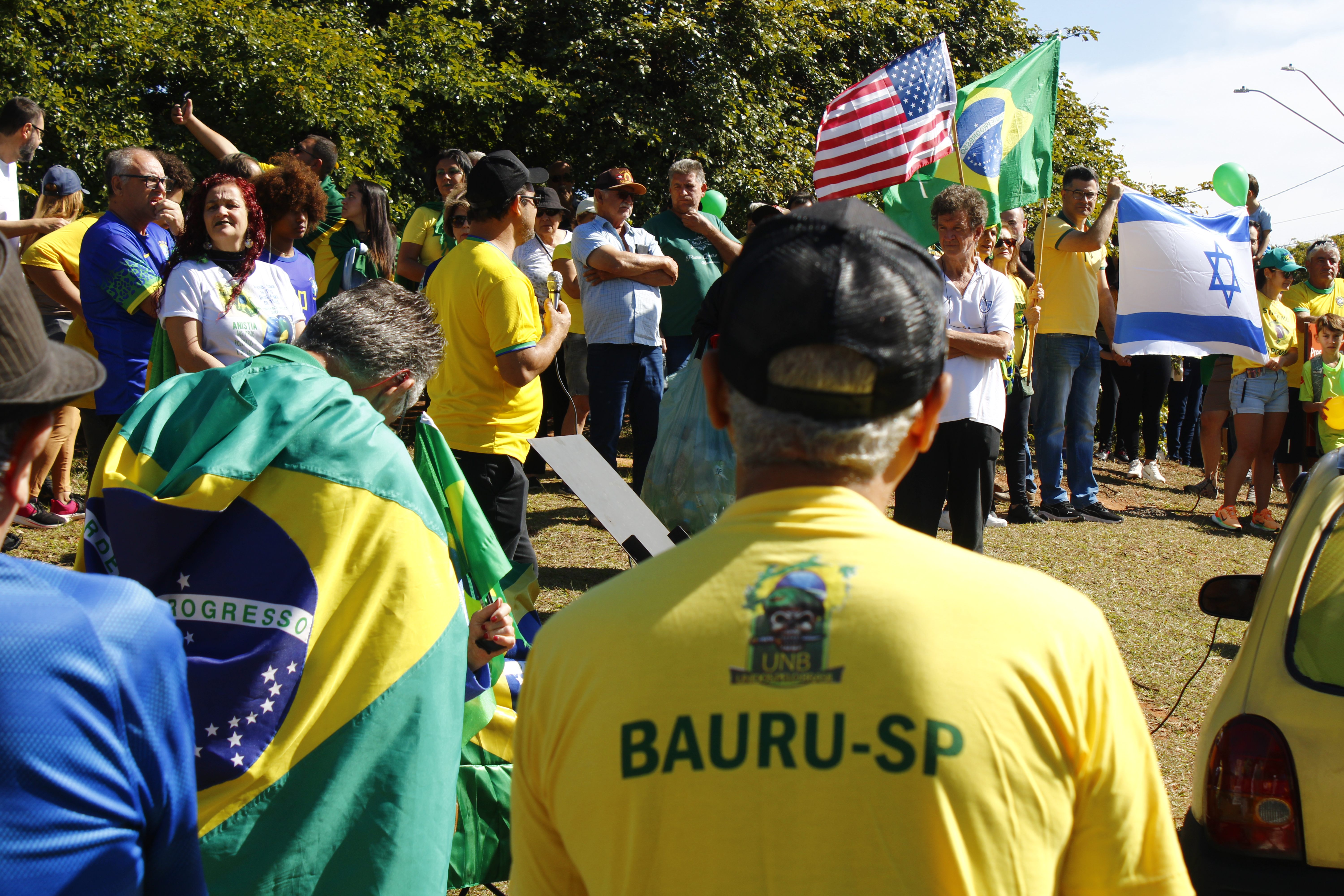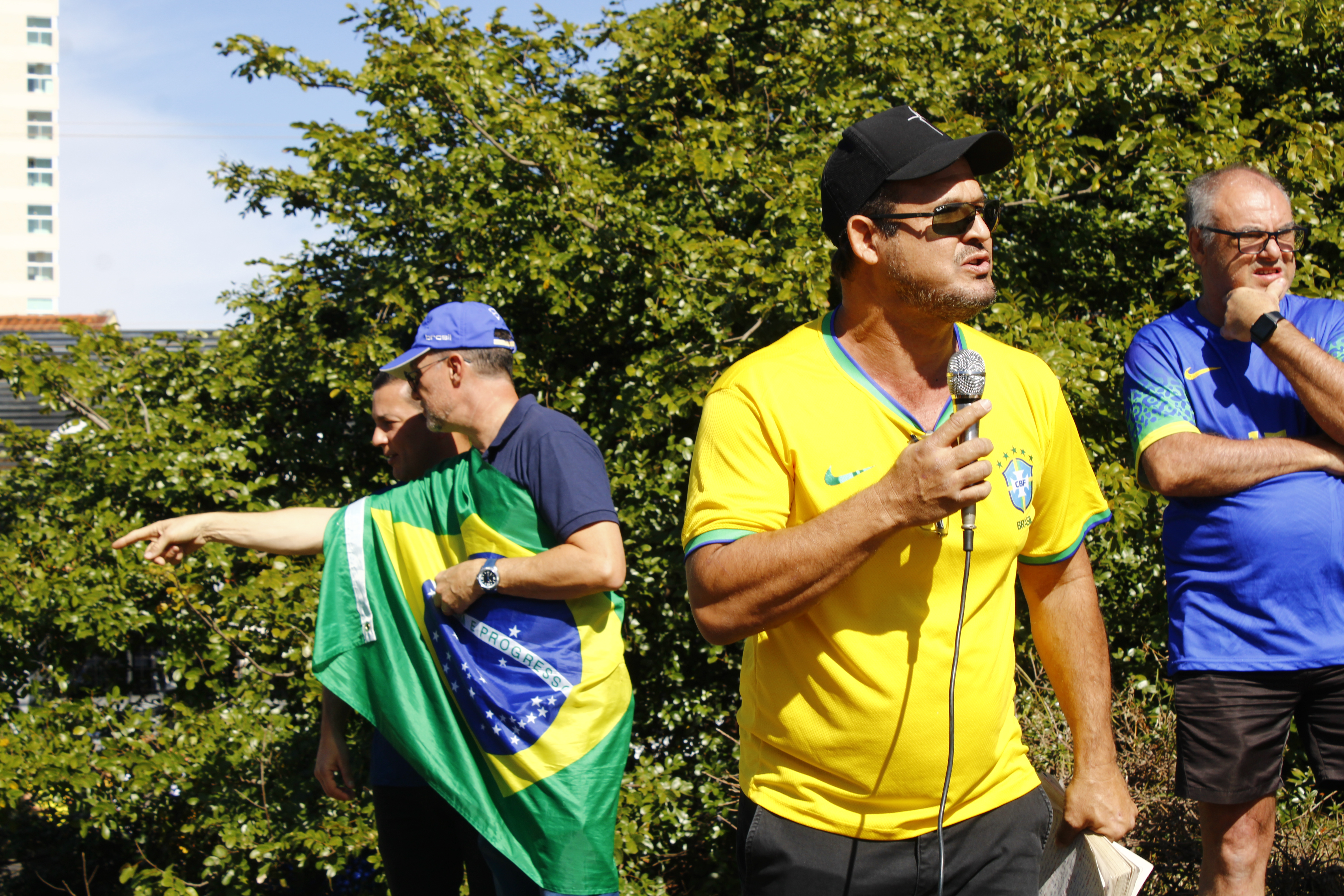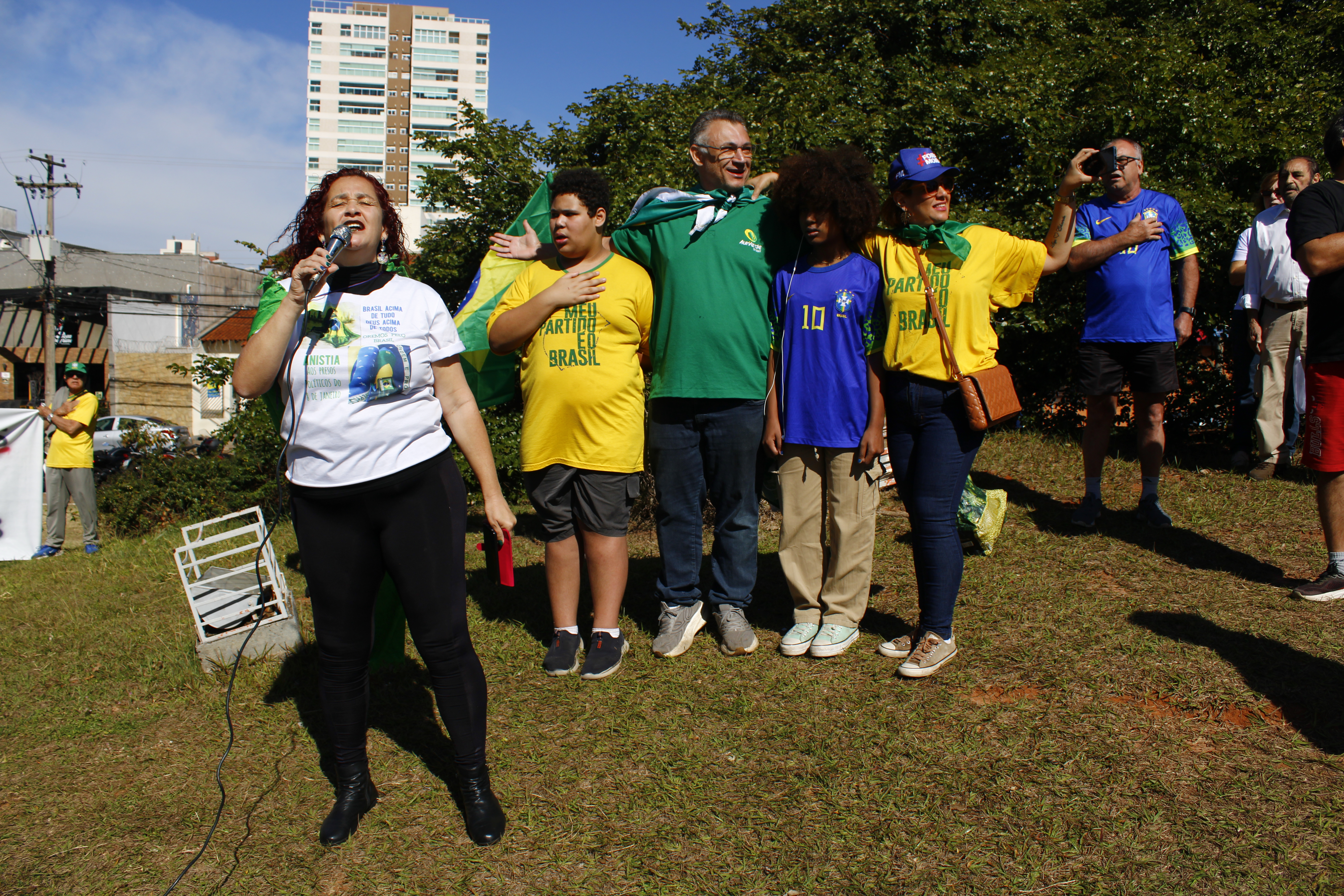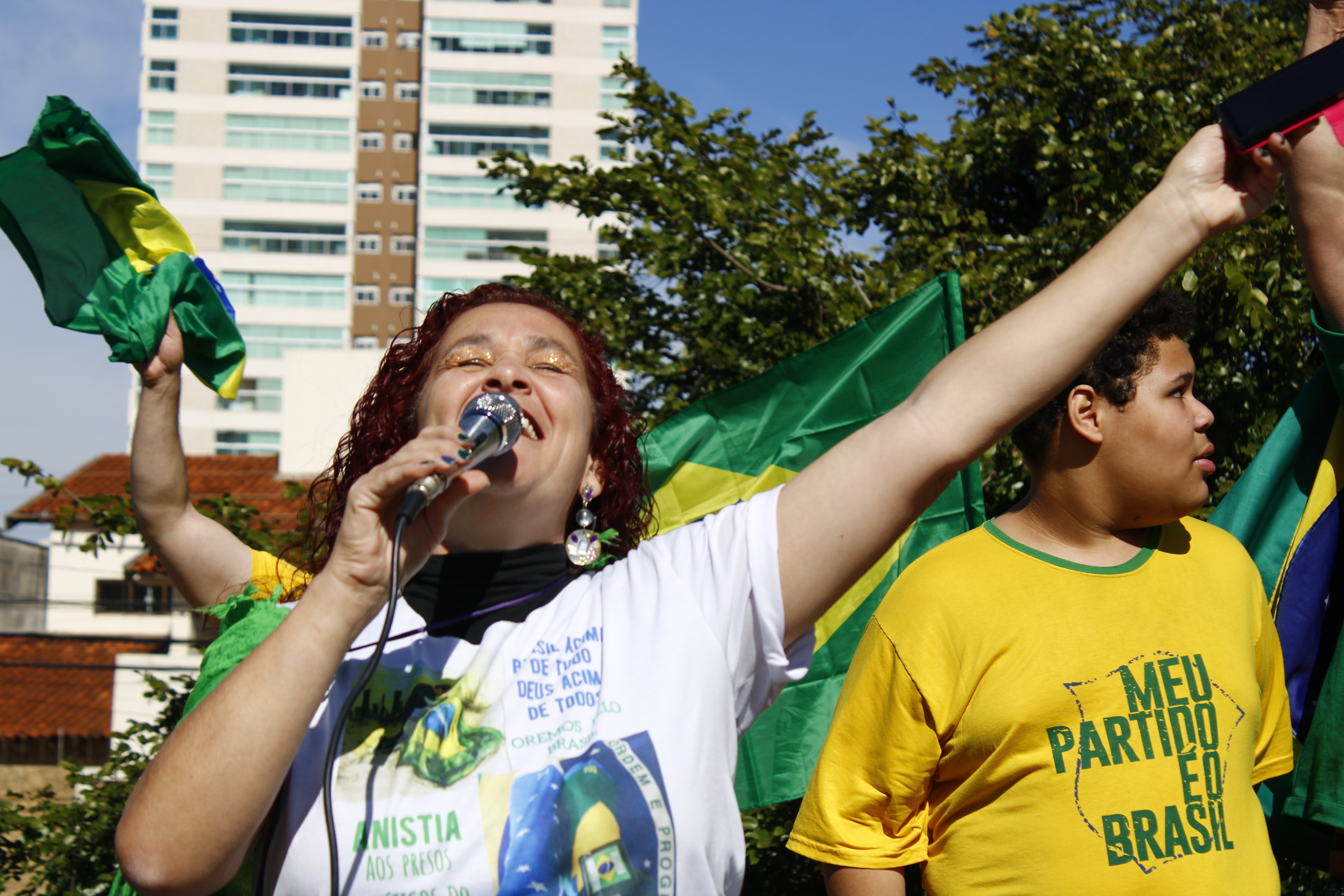 Após os discursos, os manifestantes caminharam até a quadra 5 da rua Ignacio Alexandre Nasralla, onde empunharam bandeiras do Brasil e aplaudiram motoristas que buzinavam em apoio. Um dos gritos mais ouvidos era: “A nossa bandeira jamais será vermelha”.