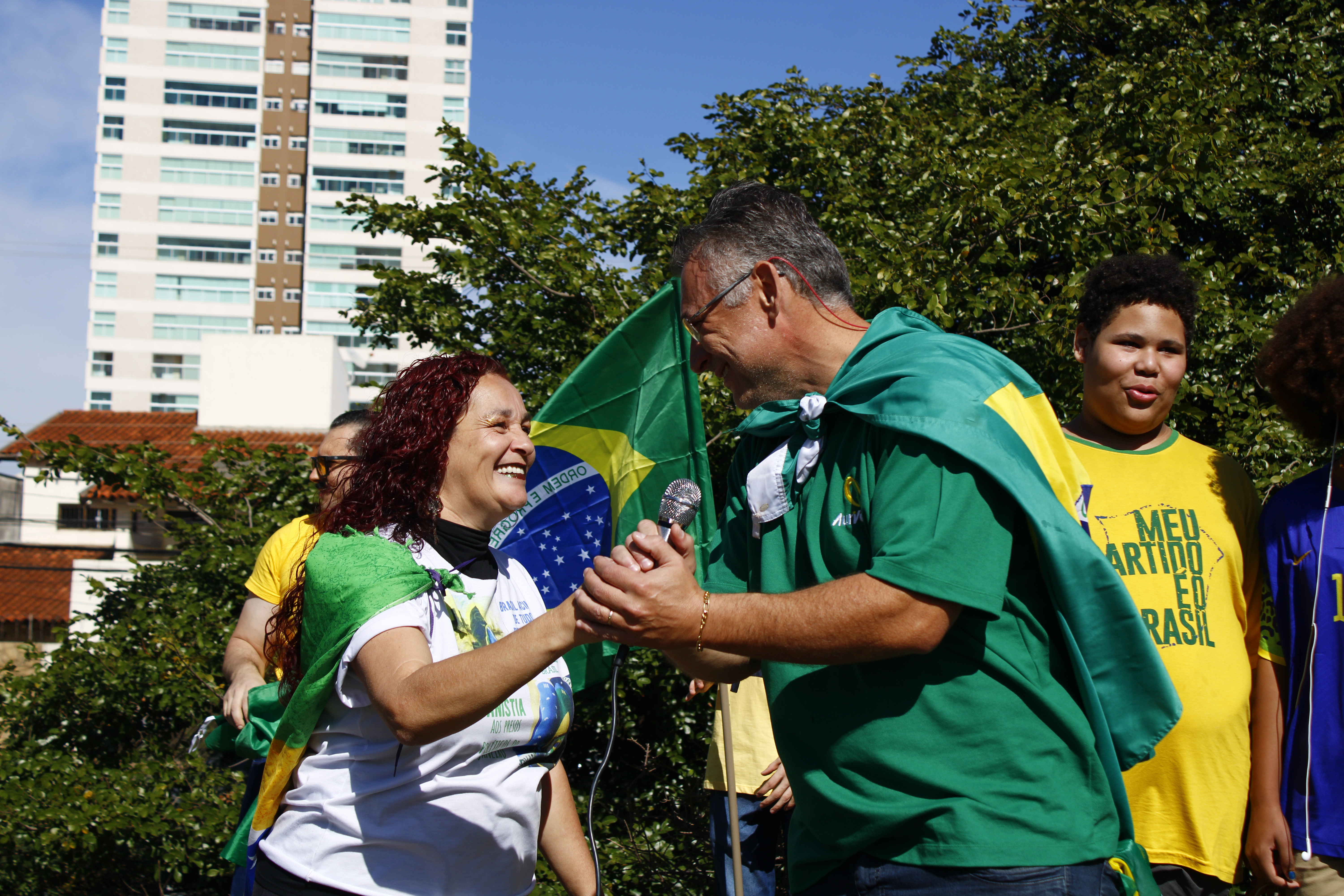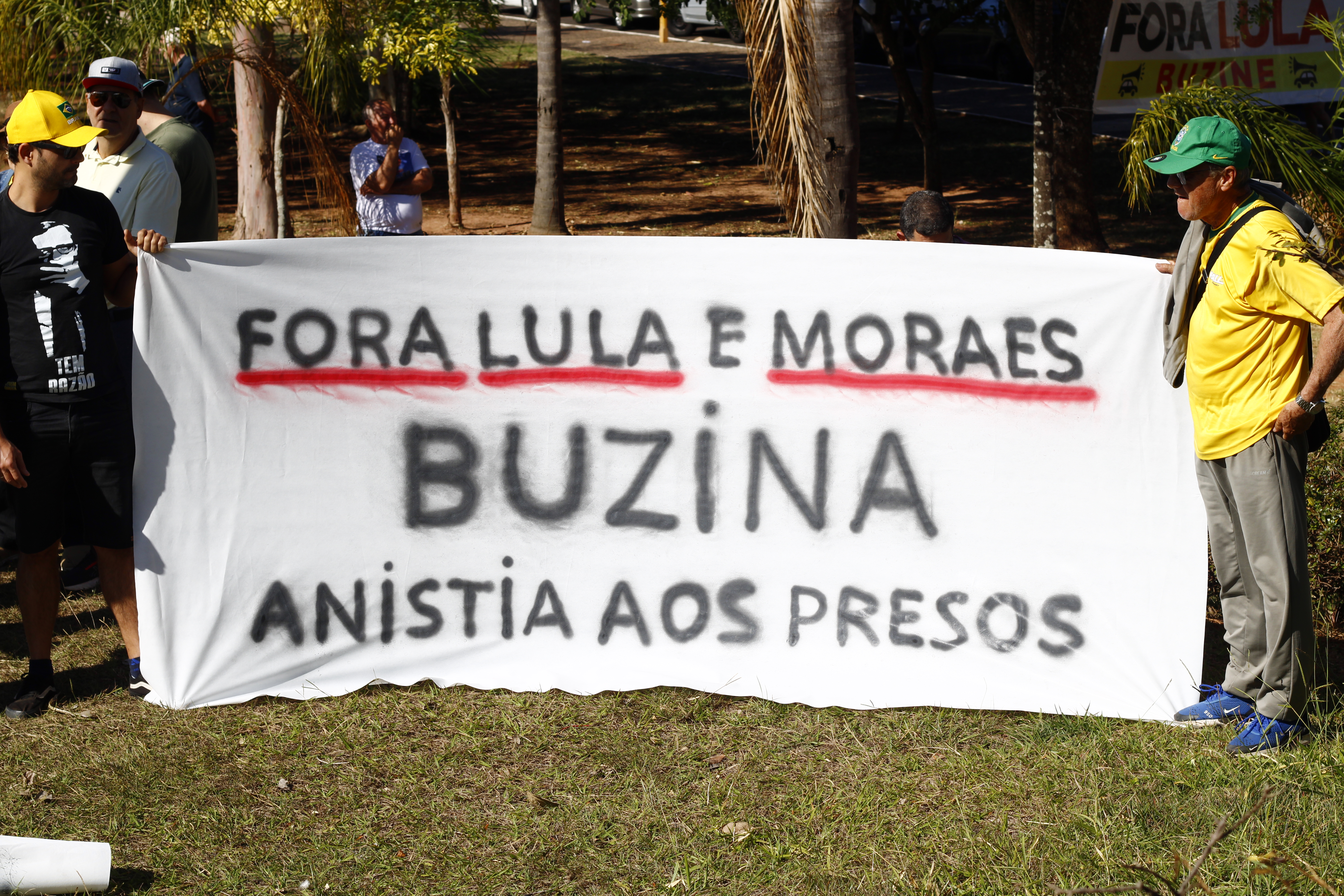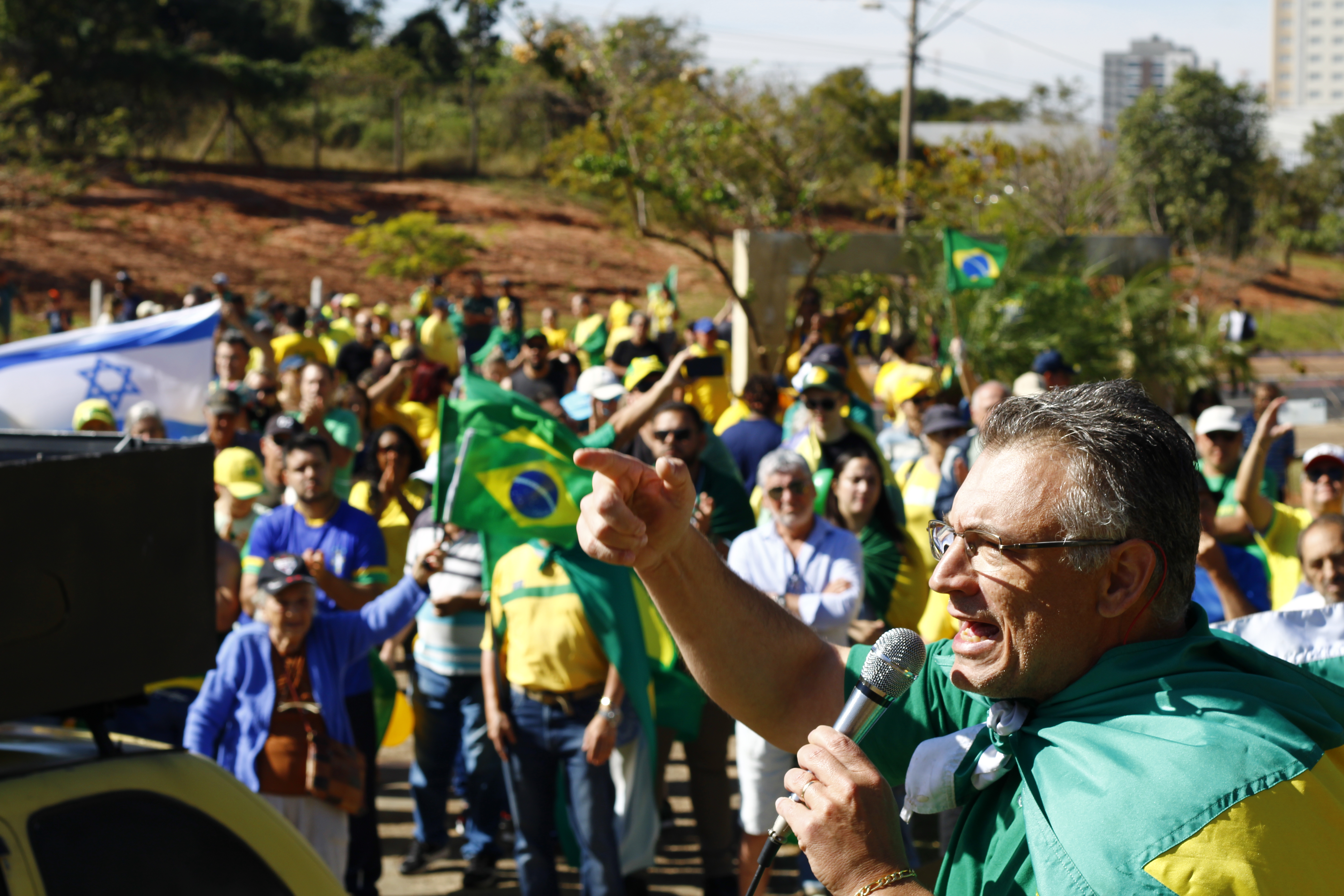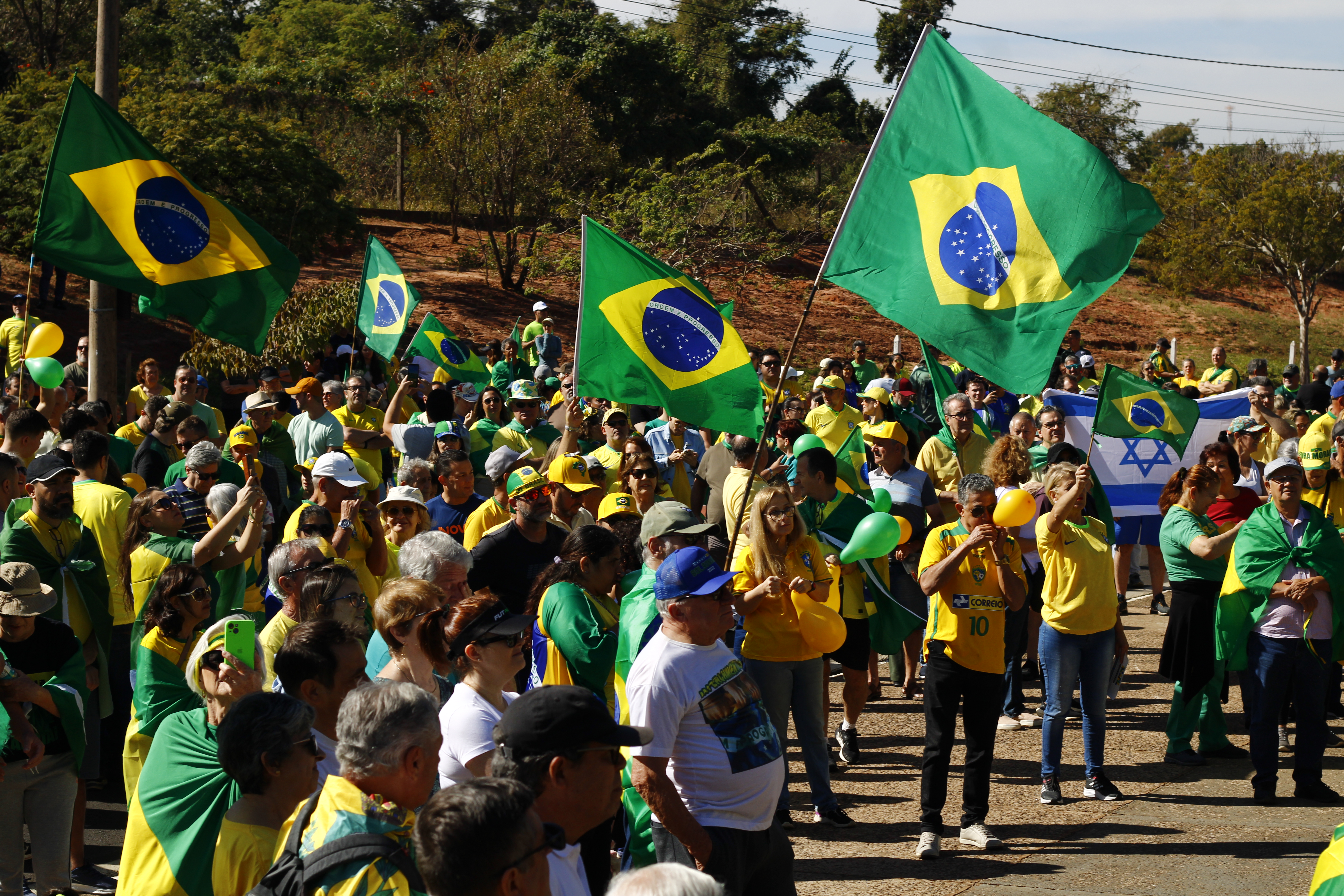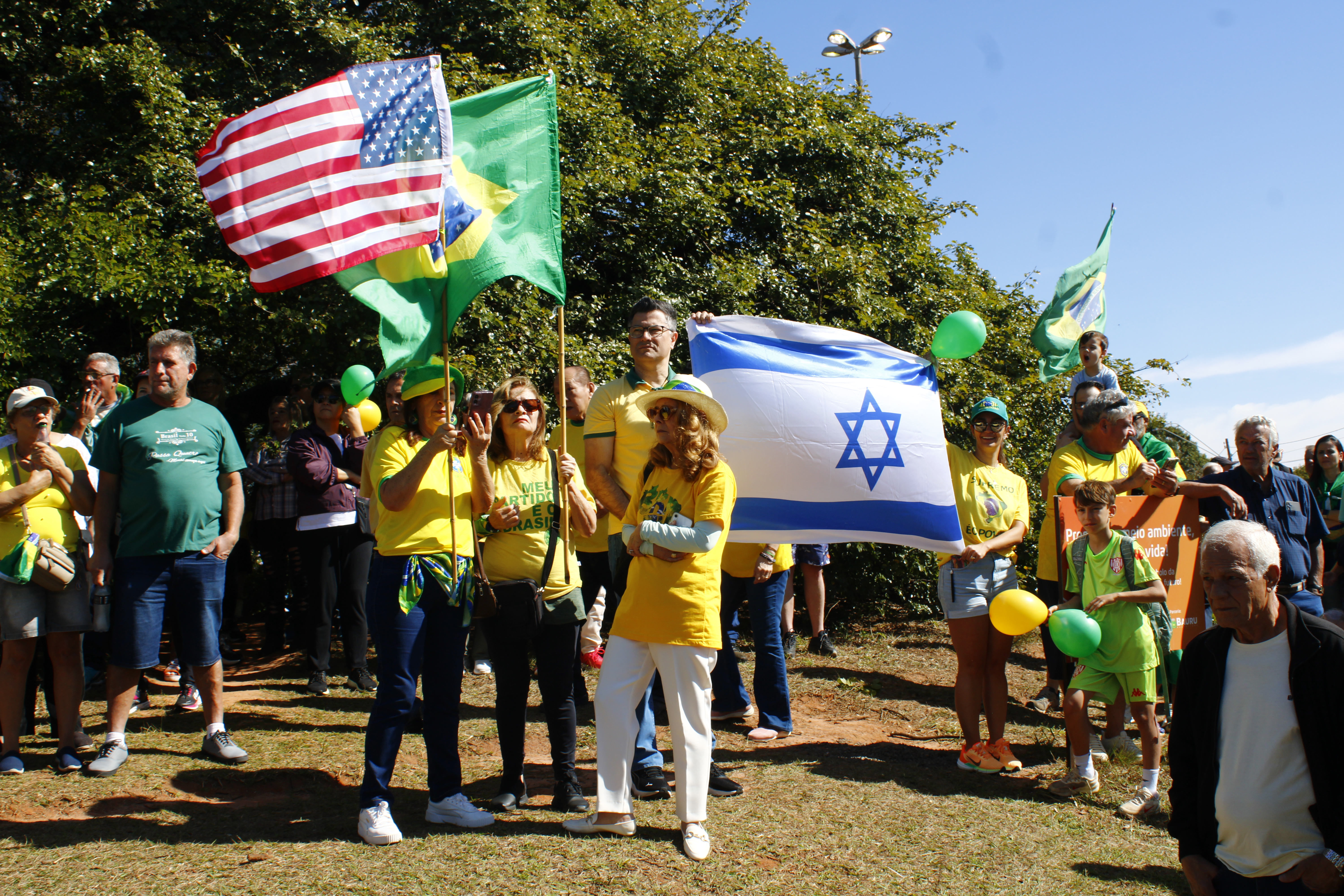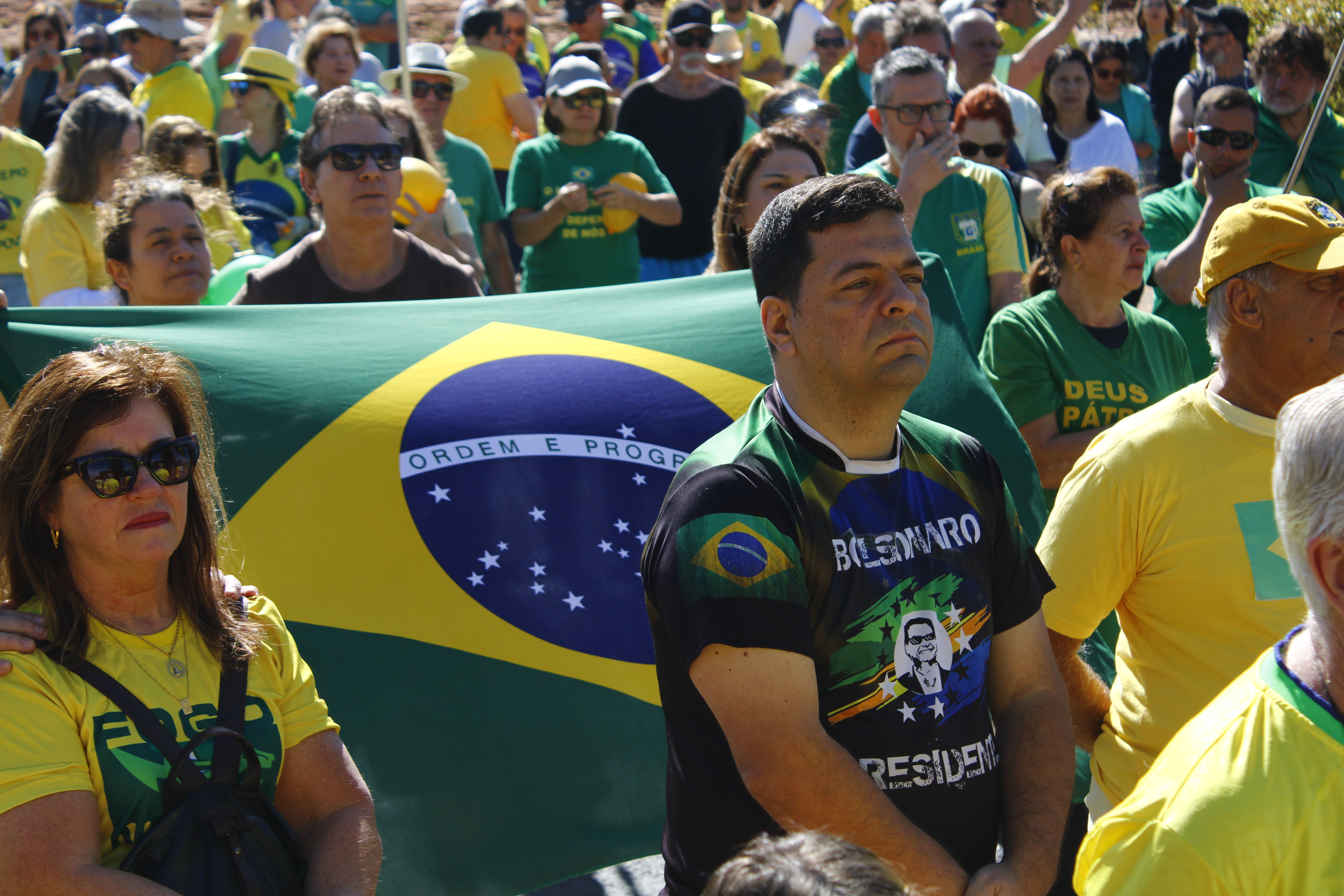 Após os discursos, os manifestantes caminharam até a quadra 5 da rua Ignacio Alexandre Nasralla, onde empunharam bandeiras do Brasil e aplaudiram motoristas que buzinavam em apoio. Um dos gritos mais ouvidos era: “A nossa bandeira jamais será vermelha”.