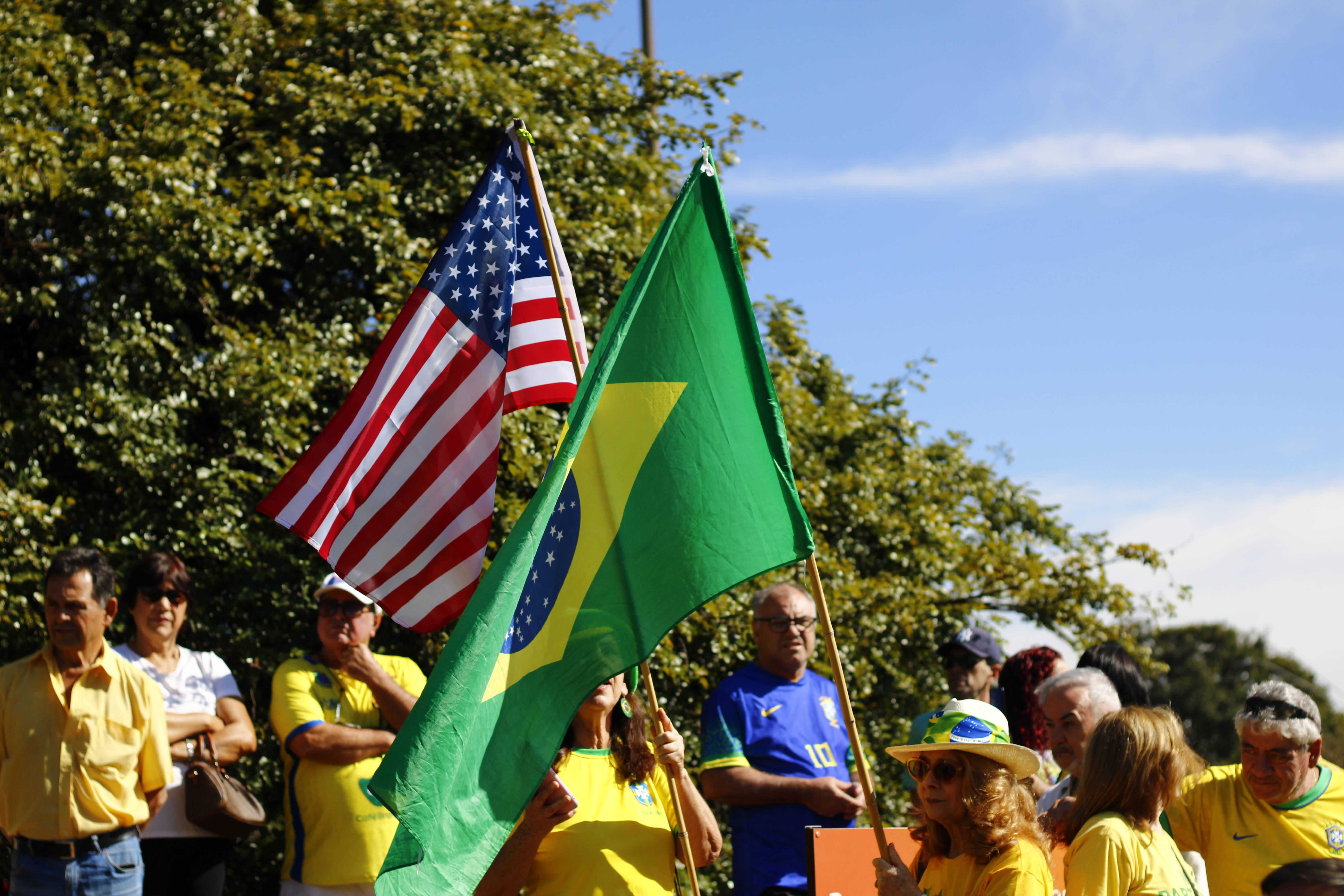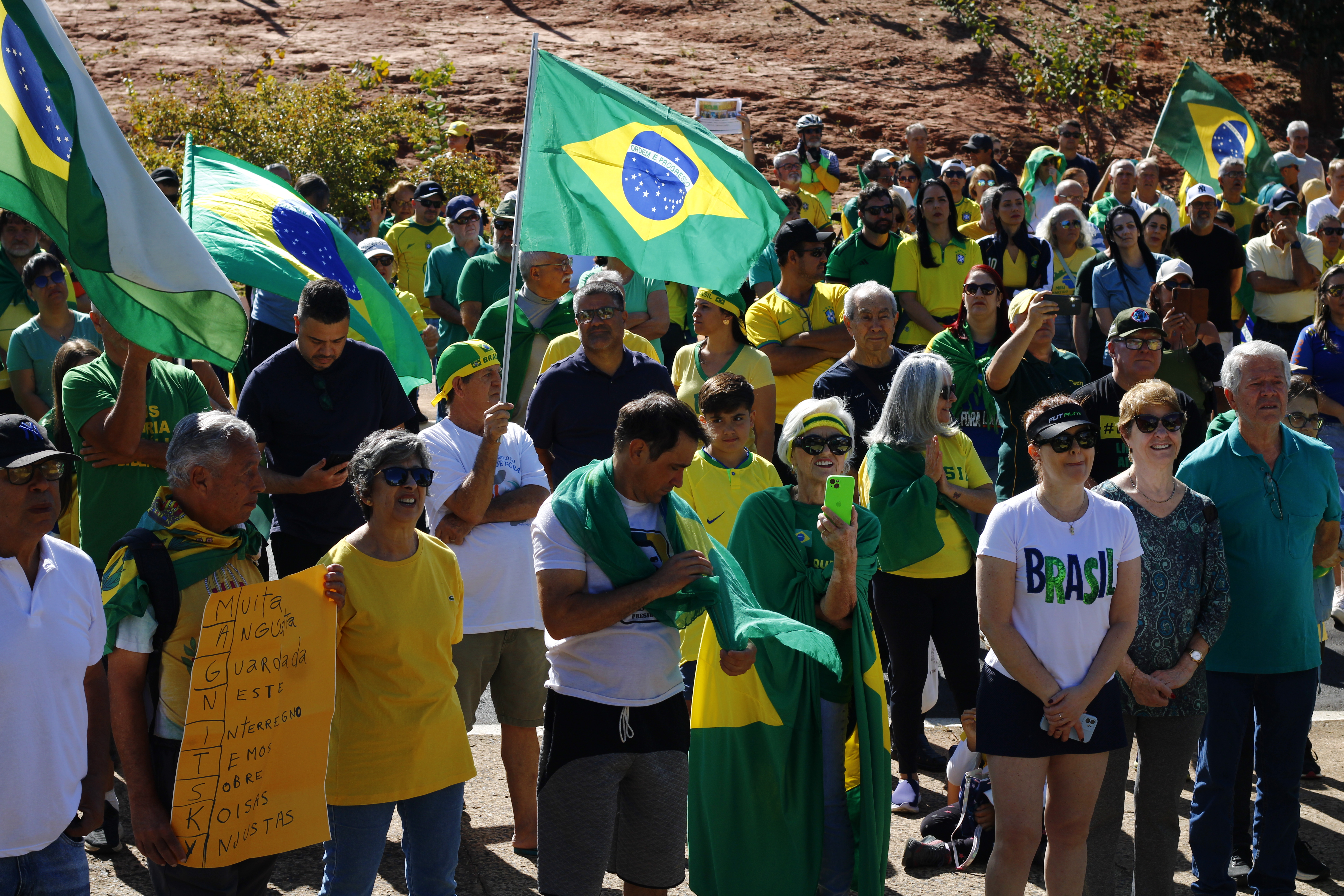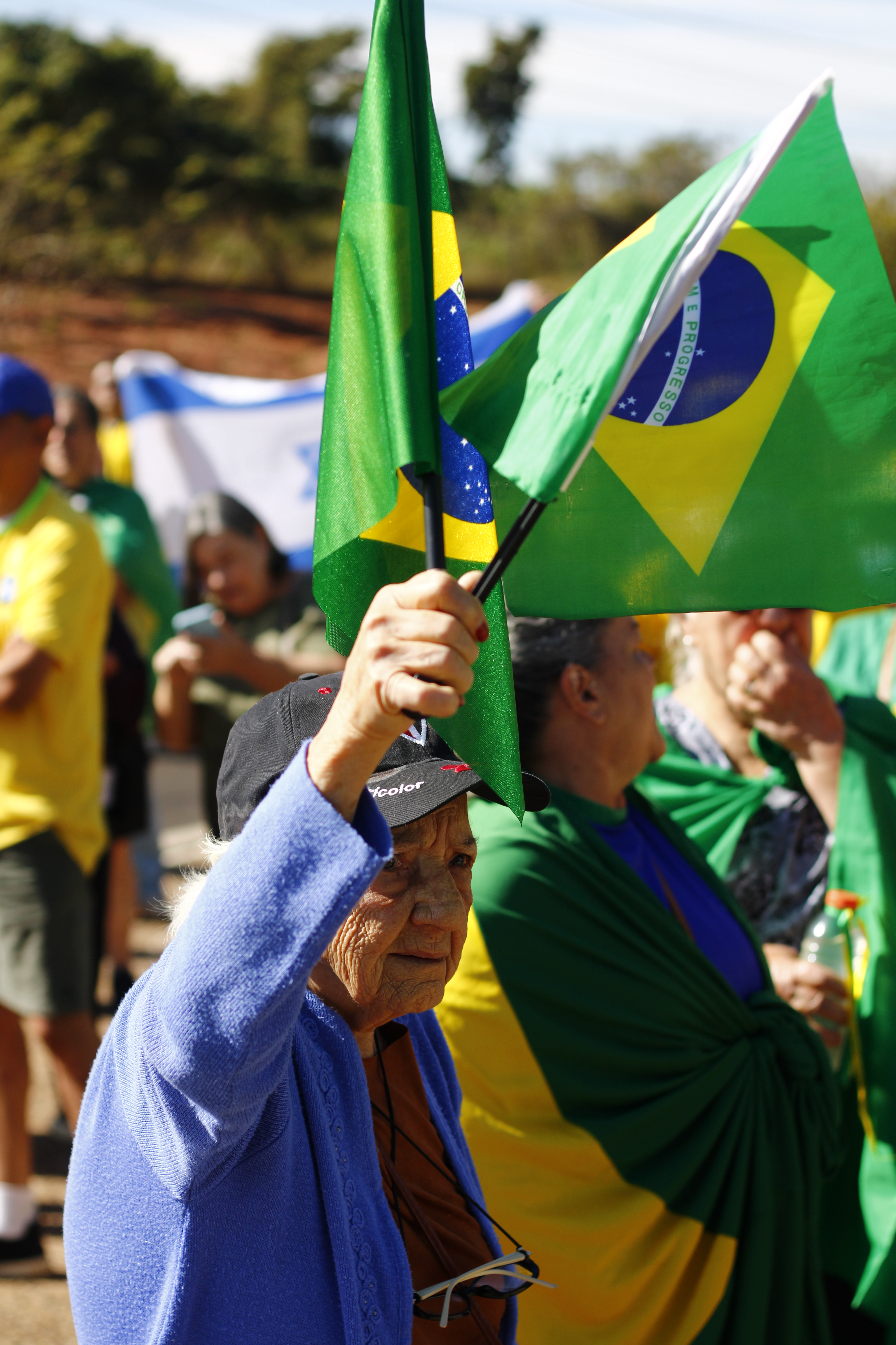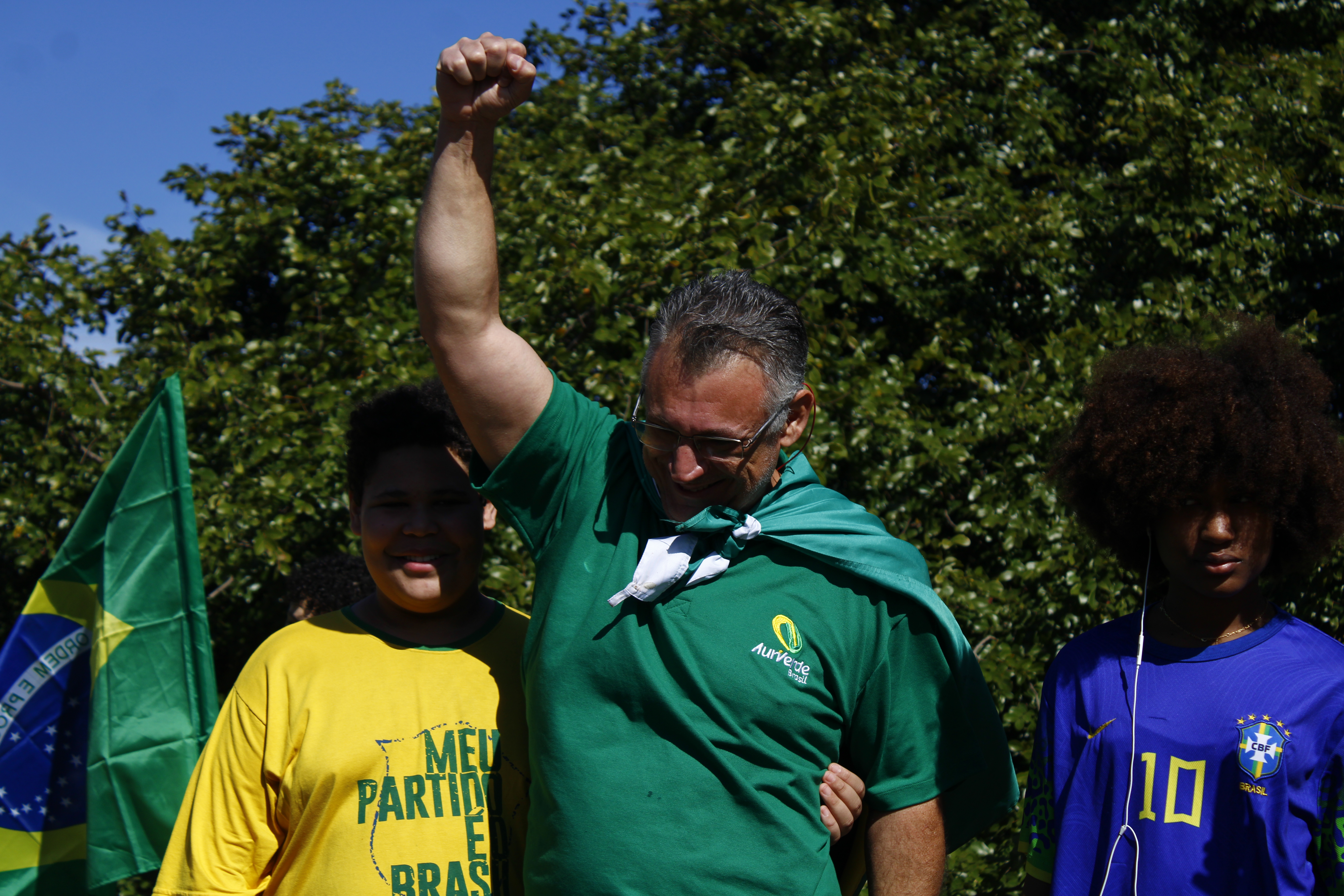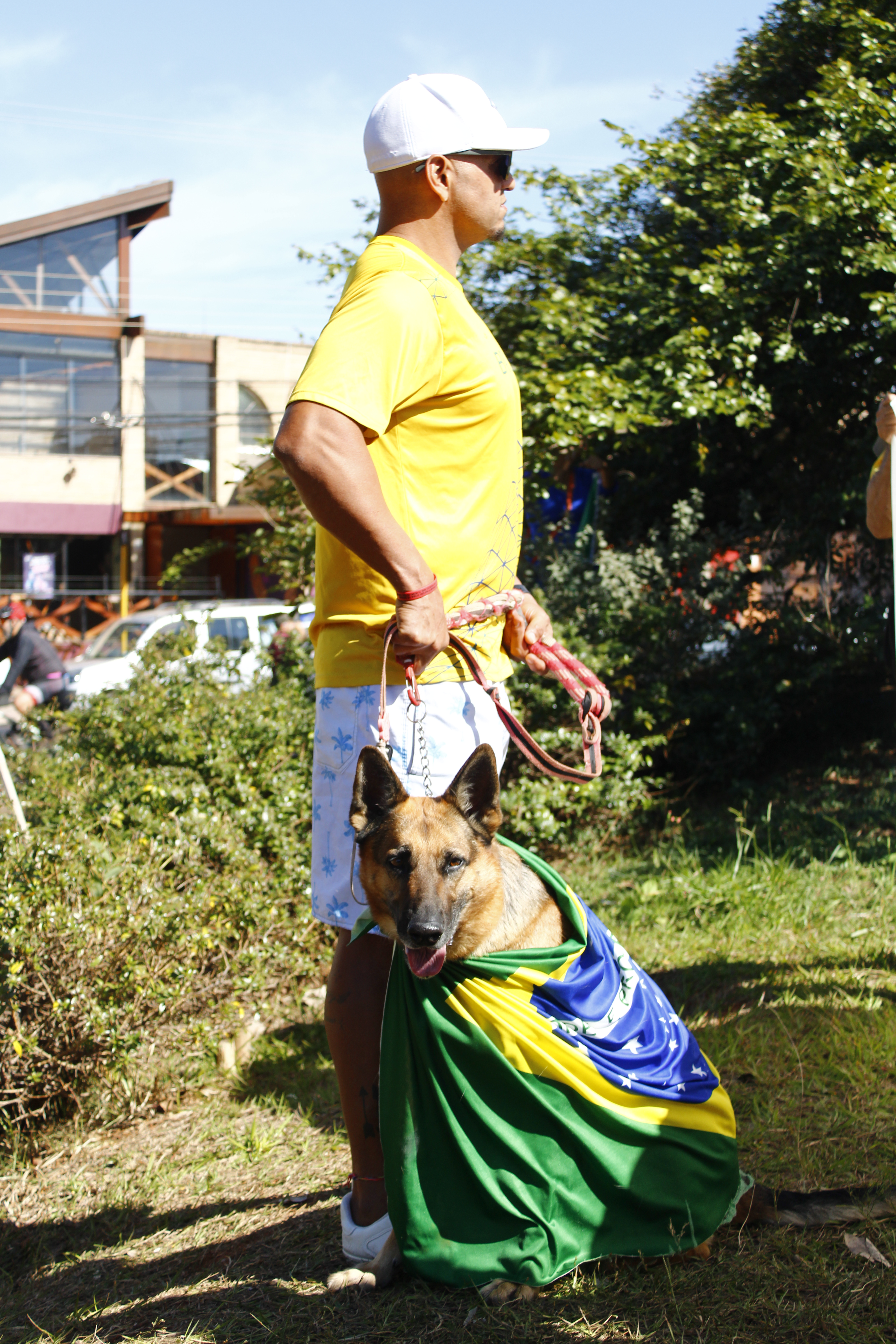 Após os discursos, os manifestantes caminharam até a quadra 5 da rua Ignacio Alexandre Nasralla, onde empunharam bandeiras do Brasil e aplaudiram motoristas que buzinavam em apoio. Um dos gritos mais ouvidos era: “A nossa bandeira jamais será vermelha”.