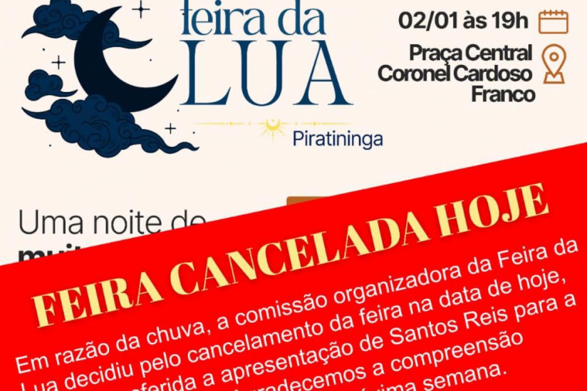 Piratininga - Em razão da chuva, a Prefeitura de Piratininga (13 quilômetros de Bauru) anunciou o cancelamento da Feira da Lua na Praça Central Coronel Cardoso Franco, que seria realizada nesta sexta-feira (2), a partir das 19h, e contaria com a apresentação especial da Folia de Santo Reis. A atração será transferida para a próxima sexta-feira (9).