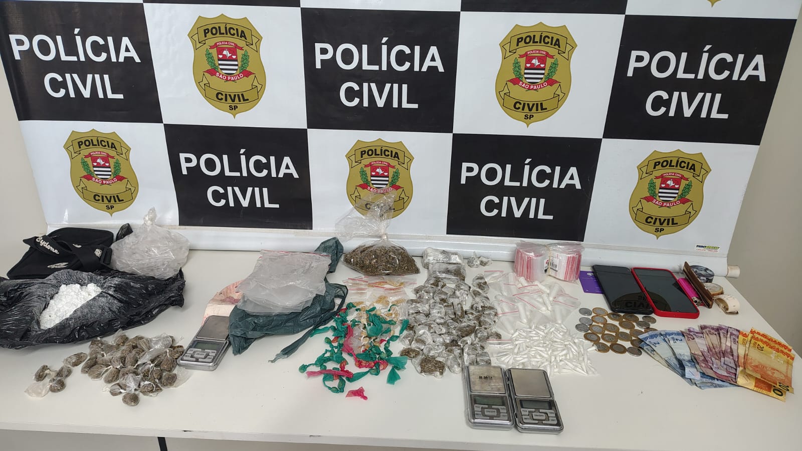 Em outro ponto do mesmo conjunto habitacional, uma van da GCM surpreendeu dois indivíduos portando pochetes com diferentes tipos de drogas. A operação identificou, ainda, um adolescente que atuava como “porteiro” do tráfico, tentando alertar demais envolvidos, e olheiros posicionados ao redor dos blocos. A ofensiva resultou na apreensão de cocaína, crack, maconha, balanças e embalagens.