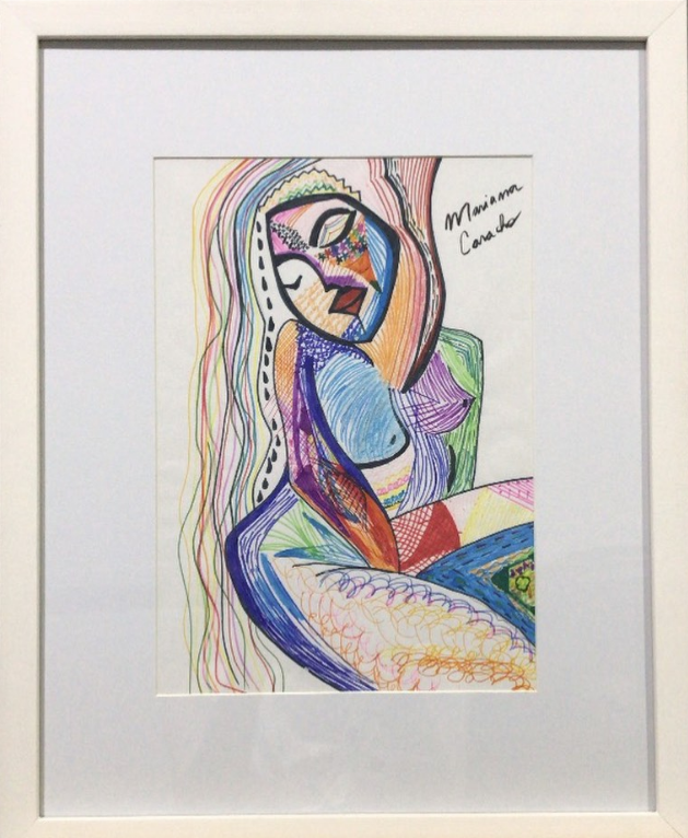 Criada em papel sulfite e com canetinhas simples, a obra surgiu de forma espontânea. “Foi uma revelação, uma surpresa. Ela me ‘jogou’ para a vida de artista”, relembra. A partir dali, Mariana passou a desenhar diariamente e desenvolveu um estilo próprio que transita entre o figurativo e o abstrato, com influência do desconstrutivismo, afirma.