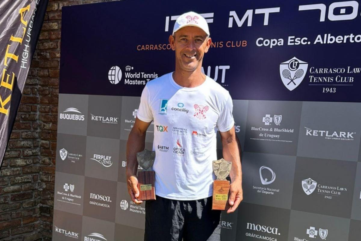 O tenista bauruense Carlinhos Oliveira, do Bauru Tênis Clube, sangrou-se campeão de Simples e de Duplas, neste sábado (28), da Copa Esc. Alberto Herrera, no Carrasco Law Tennis Club, em Montevidéu, no Uruguai. A competição de alto nível, na categoria Seniors 50+, integra o World Tennis Masters Tour da Federação Internacional de Tênis (ITF) 700.