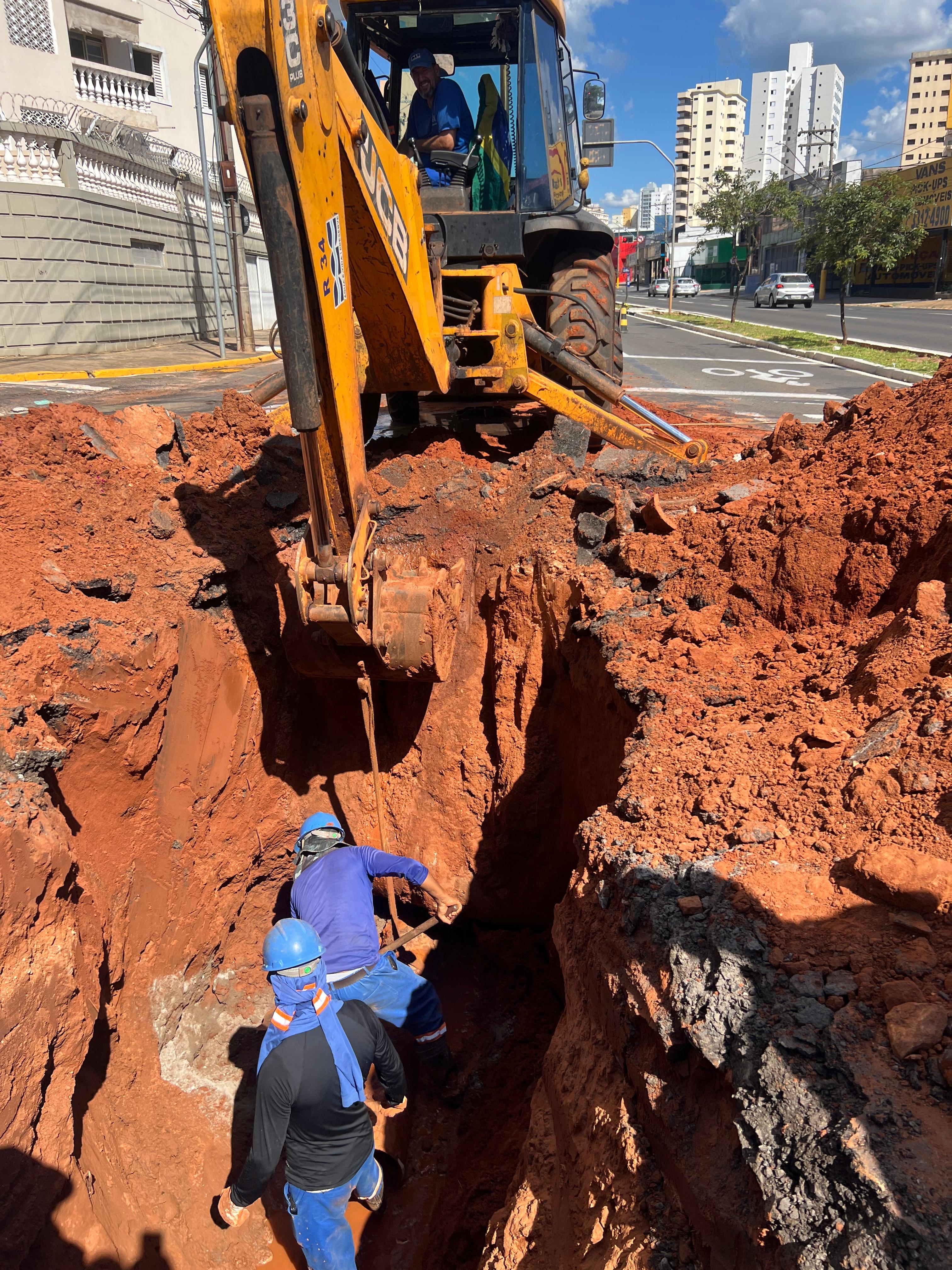 Para localizar a origem do problema, técnicos precisaram escavar um buraco com cerca de 2,30 metros de profundidade até alcançar a galeria de esgoto. Durante a intervenção, foi encontrado um bloco de concreto dentro da tubulação, que bloqueava a passagem e provocava o retorno do esgoto para a avenida.