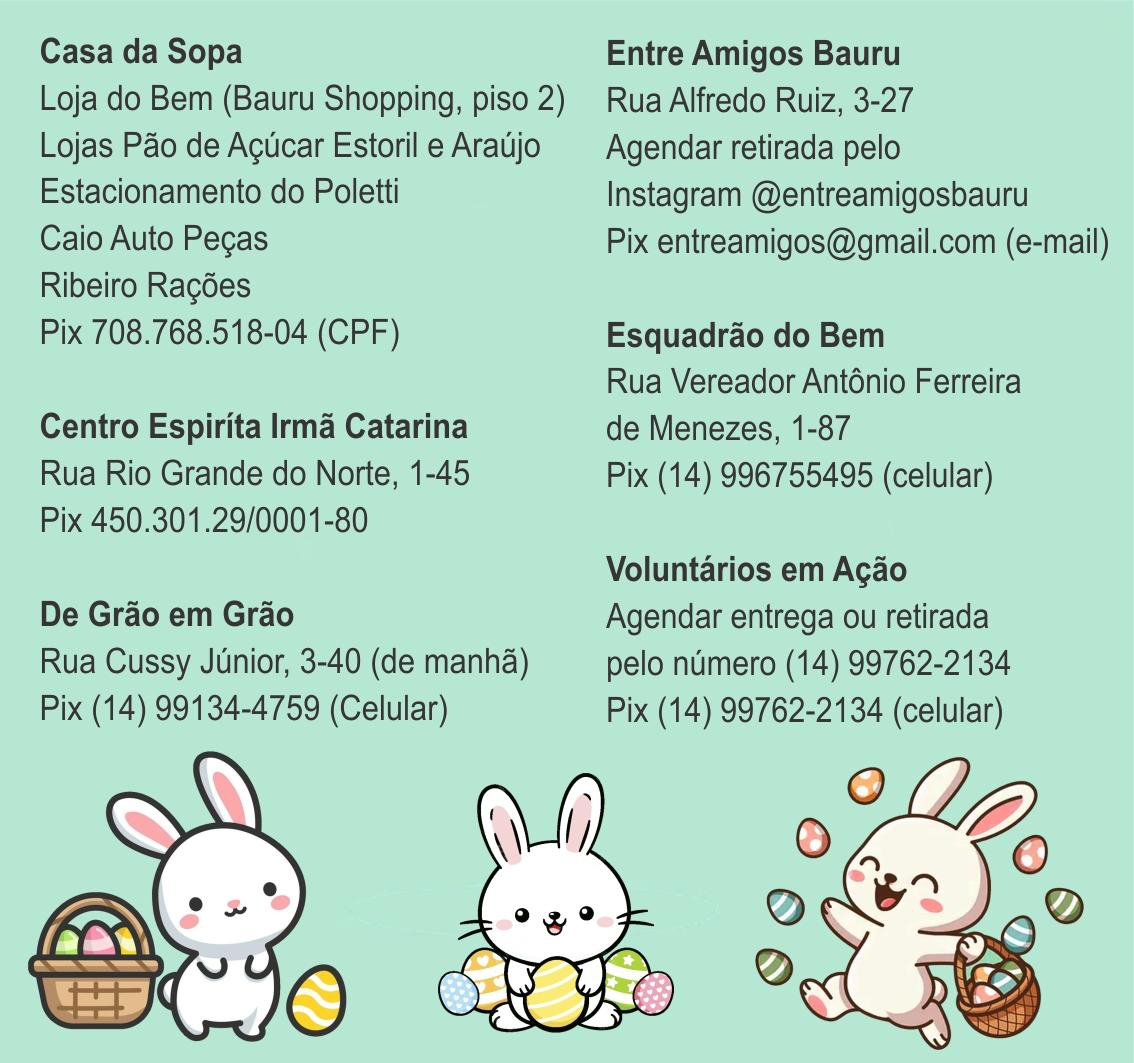 Data tradicionalmente associada à renovação, a Páscoa mobiliza campanhas solidárias de entidades assistenciais em Bauru, como Casa da Sopa, Centro Espírita Irmã Catarina, De Grão em Grão, Esquadrão do Bem, Voluntários em Ação e Entre Amigos Bauru. As organizações pedem doações de chocolates, alimentos e cestas básicas com objetivo de "adoçar" a vida de crianças, idosos e famílias em situação de vulnerabilidade durante o período.