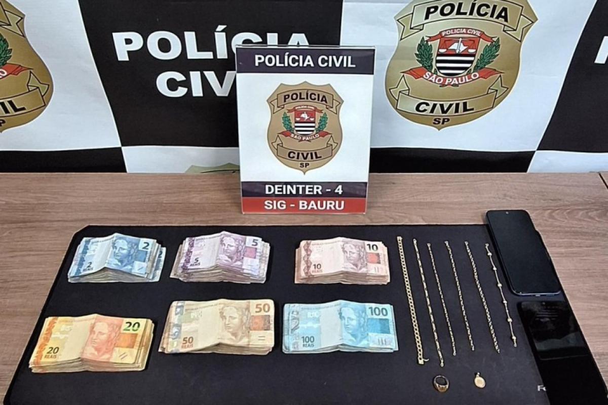 Após investigações, policiais civis do Setor de Investigações Gerais (SIG) da Central de Polícia Judiciária (CPJ) de Bauru identificaram, nesta quinta-feira (2), um casal suspeito de praticar furtos em série em lojas de Bauru e região de uma conhecida rede de joias, além de três suspeitos de receptação. A Polícia Civil recuperou parte das peças, uma delas avaliada em mais de R$ 8 mil, e apreendeu grande quantia em dinheiro.