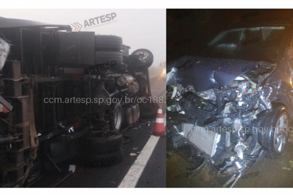 Um caminhão tombou em um trecho de pista molhada, devido a chuva, invadiu o sentido contrário de tráfego e foi atingido por um carro de passeio na madrugada desta terça-feira (7), na altura do quilômetro 395 da rodovia rodovia Comandante João Ribeiro de Barros (SP-294), a Bauru-Marília, próximo a entrada do município de Gália (a 70 quilômetros de Bauru).