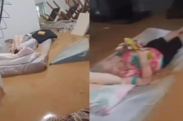 Idosos são amparados sobre colchões durante enxurrada em asilo