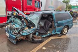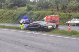 Moto fica presa em carro após acidente na Major Nicácio