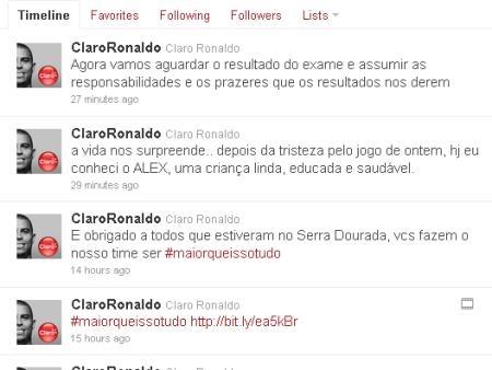 Depois de ter visto voar o título do Brasileirão na noite de ontem (5), o atacante do Corinthians Ronaldo deu pistas, através do Twitter, de que pode terminar o ano com mais um filho. Frases postadas hoje (6) em sua página no microblog indicam que ele fez um exame de DNA para saber se é o pai biológico de um garoto.