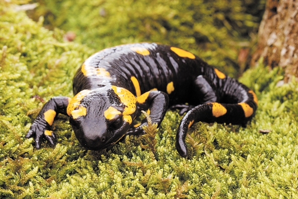 A salamandra é um réptil. Sua pele é negra e tem manchas amarelas. O tamanho varia de acordo com as espécies. As salamandras podem medir de 20 centímetros a dois metros. Colocam seus ovos na água mas têm vida terrestre.