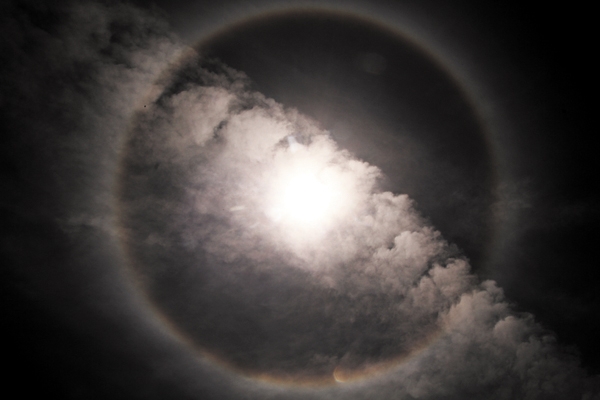O calor se fez valer em Franca, mas foi o sol que despertou a atenção dos francanos, ontem. Tudo porque a estrela estava com um adorno um tanto quanto curioso: um anel com as cores do arco-íris. Conhecido como Halo Solar, esse fenômeno óptico não anuncia o armagedom nem coisas do tipo, como aventado por aí. Ele é causado pela simples presença de cristais de gelo na termosfera, a camada atmosférica mais extensa de todas, 500 quilômetros distante do solo. A luz solar acaba refletindo nos pequenos cristais, o que origina esse círculo.