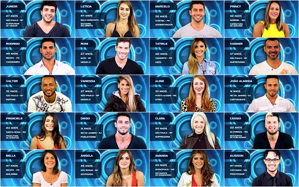 Na próxima terça-feira, dia 14, estreia a 14ª edição do programa. Com maior número de candidatos, a casa mais vigiada do Brasil terá neste ano 20 confinados. São eles: Aline, 33 anos, atriz, de Porto Alegre (RS); Bella, 27 anos, bailarina, de Recife (PE); Vanessa, 27 anos, modelo, de São Paulo (SP); Letícia, 27 anos, bacharel em Direito, de Belo Horizonte (MG); Tatiele, 22 anos, Miss, de Cianorte (PR); Princy, 32 anos, corretora de imóveis, de Goiânia (GO); Clara, 25 anos, empresária, de São Paulo (SP); Franciele, 24 anos, produtora de eventos, Santa Rosa (RS); Amanda, 23 anos, estudante de engenharia, de Divinópolis (MG); Angela, 26 anos, advogada, de São Roque (SP); Valter, 35 anos, rapper, de São Paulo (SP); Vagner, 37 anos, empresário, de São Paulo (SP); João Almeida, 31 anos, cartomante, do Rio de Janeiro (RJ); Júnior, 27 anos, supervisor de vendas, de São Paulo (SP); Cássio, 22 anos, estudante de publicidade, de Alvorada (RS); Marcelo, 26 anos, administrador, de Curitiba (PR); Alisson, 27 anos, professor, de Contagem (MG); Diego, 31 anos, publicitário, do Rio de Janeiro (RJ); Roni, 27 anos, modelo, de Iacri (SP); Rodrigo, 28 anos, cozinheiro, de Recife (PE).