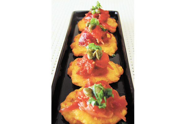 Para fazer os patacones, arranje banana da terra verde. Minhas amigas cubanas, Aniette e Lupe, médicas que escolheram Franca para morar, e que amam o prato bastante popular também em seu país natal, me disseram ter encontrado plátanos verdes no supermercado São Paulo. “Seu Aparecido arrumou para nós”, me disse Aniette com seu inconfundível sotaque. Eu consegui as minhas na feira da Major Nicácio. Levei-as para a cozinha e procurei me lembrar de como as vi sendo preparadas no Caribe. Descasquei-as e cortei cada uma em três partes. Deixei repousar em água gelada onde mergulhei três dentes de alho amassados, para, como dizem, saborizá-la. Aqueci bem o óleo. Retirei os pedaços da água, escorri e mergulhei no óleo quente. Deixei dourar, retirei com espumadeira, dispus sobre papel toalha. Na Colômbia usam um utensílio, a pataconeira, para amassar cada um desses pedaços fritos até que tomem o formato de um medalhão. Também vi um chef com muita prática, em restaurante de Bogotá, formatando os pedaços na palma das mãos, com grande êxito. Na falta de ambas, pataconeira e habilidade, usei a base de uma taça de martini para ir transformando os cilindros em discos finos. Depois de todos prontos, fritei-os de novo em óleo bem quente, até ficarem dourados e crocantes. Deixei escorrer uns minutos e coloquei em cima um molho de tomates-cerejas que tinha feito antes. Decorei com alcaparras, tempero muito usado por lá. Poderia ter coberto com frango, carne, champignons, camarões, bacalhau e outras preparações que a inspiração sugerisse. Fica o convite para que muitos ousem com seus ingredientes preferidos ou mais próximos de sua mão.