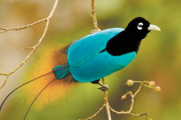 Seu nome evoca não só sua beleza como também o fato de que seu habitat era no século XVII (e continua sendo) florestas quase intocadas. As longas penas deste pássaro são de um colorido bastante intenso. Até parecem enfeites. Mas só os machos exibem caudas e topetes gigantes e coloridos, as fêmeas têm penas marrons que usam para camuflar e proteger o ninho. Assim funciona a natureza.