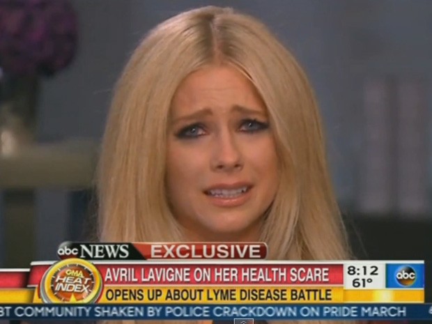Avril ainda revelou que pensou que morreria por causa da doença. "Eu não tinha ideia de que uma mordida de carrapato poderia fazer isso", confessa. A cantora tem tomado antibióticos e se diz feliz por saber que a recuperação será total. Atualmente, ela permanece em Ontario, Canadá.