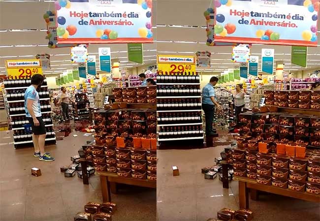 Neste momento, outros homens aparecem e conseguem retirar a mulher do local. É possível ver o chão do supermercado todo coberto por vidros e vinho, sendo que as prateleiras onde o produto estava aparecem praticamente vazias.
