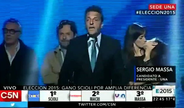 Sergio ficou em terceiro lugar e não participa das eleições do segundo turno. O argentino ainda não decidiu qual candidato apoiar. Enquanto discursava, a jovem Milagros deu um beijo nos lábios da mãe Malena Galmarini. Ao lado de ambas estava Mauricio Macri, ex-prefeito de Buenos Aires, um dos candidatos que disputará as eleições. Malena é esposa do ex-prefeito e Milagros, filha dele.