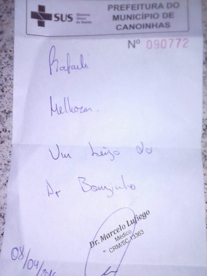 A menina foi atendida pelo médico Marcelo Lufiengo, já na madrugada do dia 8. Ao final do atendimento, Marcelo entregou a receita médica a Veri. "Vi nos olhinhos dela [Rafaeli] quando entreguei a receita à sua mãe, que ela também queria um papel do médico. Ganhou uma receita de carinho", contou o médico ao site Extra. Na receita entregue a Rafaeli, Marcelo escreveu "Rafaeli, melhoras. Um beijo do Dr. Bonzinho".