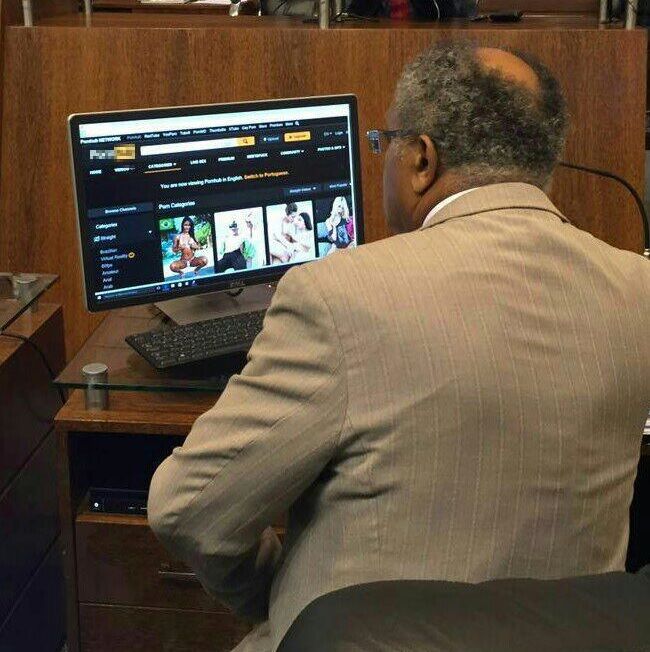 Na foto, o vereador Lino Peres (PT) aparece olhando para a tela de um computador durante uma sessão da Câmara Municipal de Florianópolis. No monitor, aparece a página de um site pornográfico.